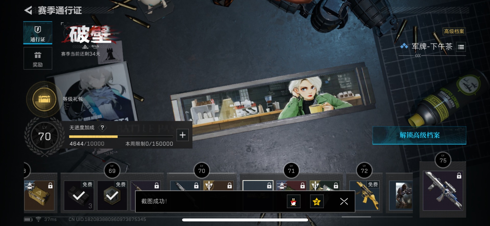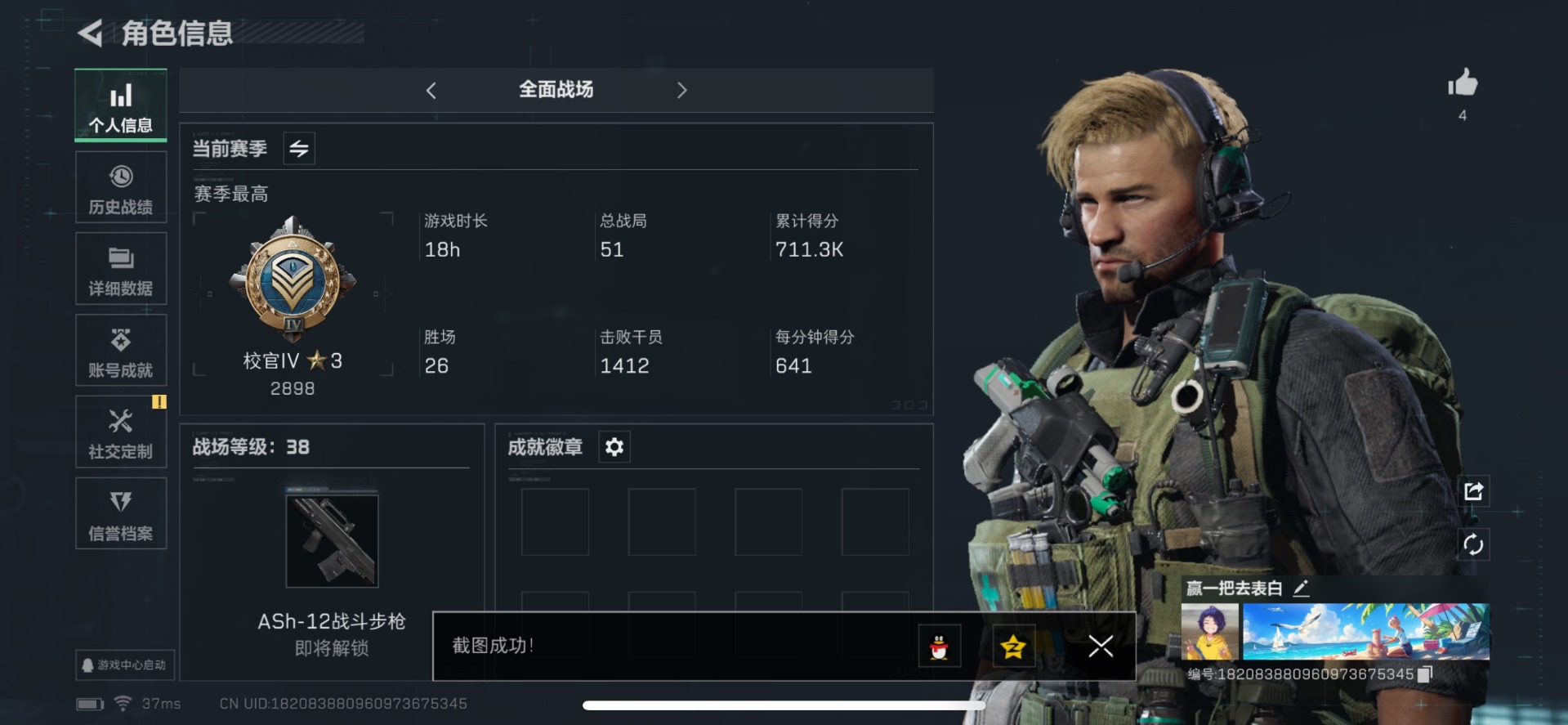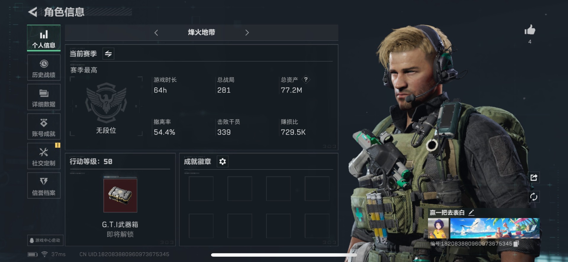 - [11348737]总资产:218.8M 1近战传说 11传说枪械 哈夫币:29.122K 可二次 可修改实名 优质装备:近战-北极星,顶级安全箱(3x3) 烽火地带段位:黄金 全面战场段位:列兵 传说武器皮肤:AK-12突击步枪-夜鹰,M4A1突击步枪-阿米娅,复合弓-黑-天际线,AWM狙击步枪-捞点薯条,QCQ171冲锋枪-北极星,腾龙突击步枪-捞点薯条,93R-捞点薯条,勇士冲锋枪-能天使-午夜邮差,725双管霰弹枪-送葬人-无题密令,K437突击步枪-北极星 史诗武器皮肤:Ash-12战斗步枪-守夜人,PKM通用机枪-守夜人,AS Val突击步枪-尖端治疗,M700狙击步枪-守夜人,SG552突击步枪-尖端治疗,SR-25射手步枪-尖端治疗,PKM通用机枪-荒野求生,AKM突击步枪-林中猎手,SR-3M紧凑突击步枪-荒野求生,M1014霰弹枪-林中猎手,SV-98狙击步枪-林中猎手,PTR-32突击步枪-英雄,SVD狙击步枪-荒野求生,AS Val突击步枪-典狱官,SCAR-H战斗步枪-囚徒,腾龙突击步枪-无垢,MP7冲锋枪-无垢,PSG-1射手步枪-无垢,QBZ95-1突击步枪-曙光,沙漠之鹰-曙光