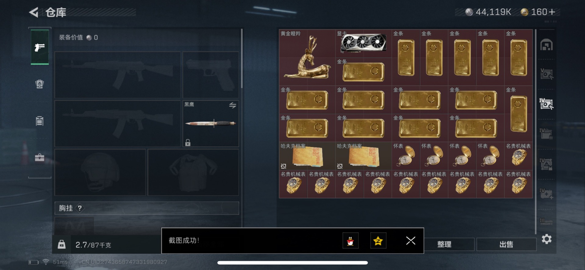 [11515066]总资产:139.3M 4传说枪械 哈夫币:44.119K 进阶安全箱(9.17到期) 可二次 可修改实名 烽火地带段位:三角洲巅峰 全面战场段位:无段位 传说武器皮肤:SCAR-H战斗步枪-铁艺苍穹,SMG45冲锋枪-骑士,复合弓-黑-天际线,勇士冲锋枪-能天使-午夜邮差