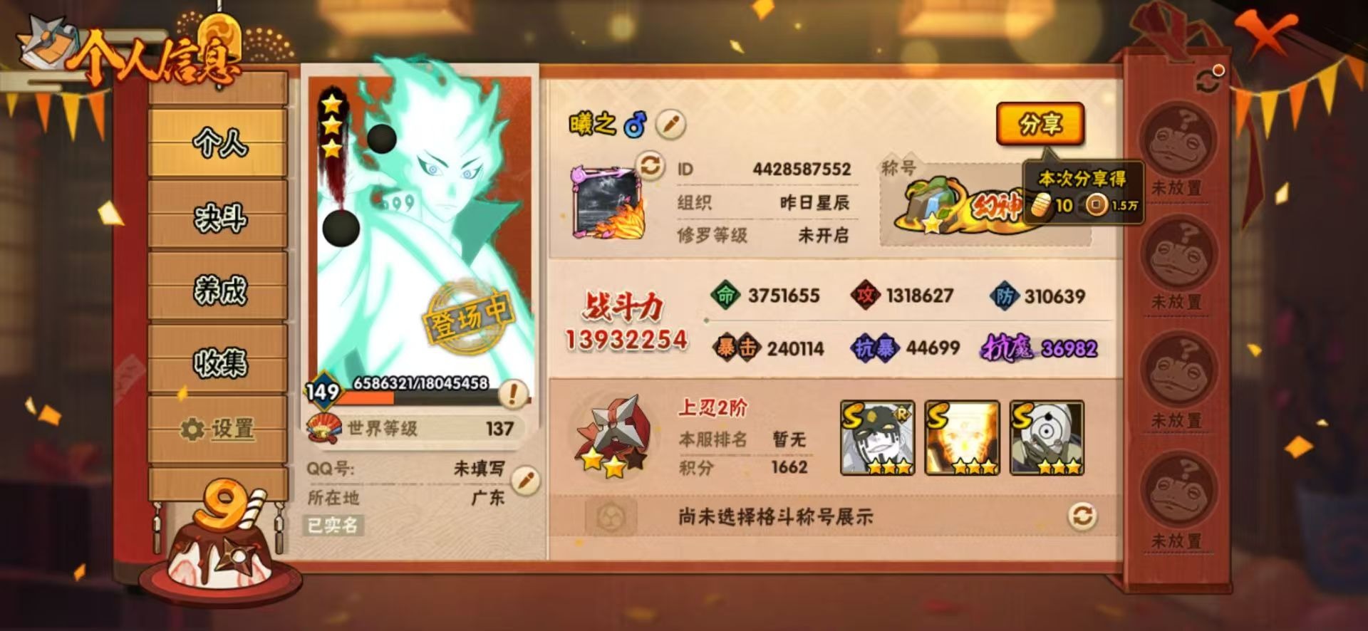[11515123]V11 26S忍 37A忍 1393.2W战力 可二次 可修改实名 S级忍者:宇智波止水「须佐能乎」,大筒木桃式,宇智波斑「秽土转生·解」,千手柱间·木叶创立,宇智波佐助「永恒万花筒」,神秘面具男 「红夜之刃」,春野樱 「忍界大战」,大筒木金式「博人传」,漩涡鸣人 「九喇嘛连结」,大野木 「忍界大战」,迈特凯「死门」,宇智波斑 「木叶创立」,宇智波带土 「忍界大战」,自来也 「舞之豪杰」,旗木卡卡西「须佐能乎」,大筒木舍人 「最终章」,宇智波鼬「秽土转生」,“宇智波斑” 「白面具」,猿飞日斩「秽土转生」,宇智波鼬 「须佐能乎」,佩恩「天道」,猿飞日斩,波风水门,大蛇丸,自来也,纲手