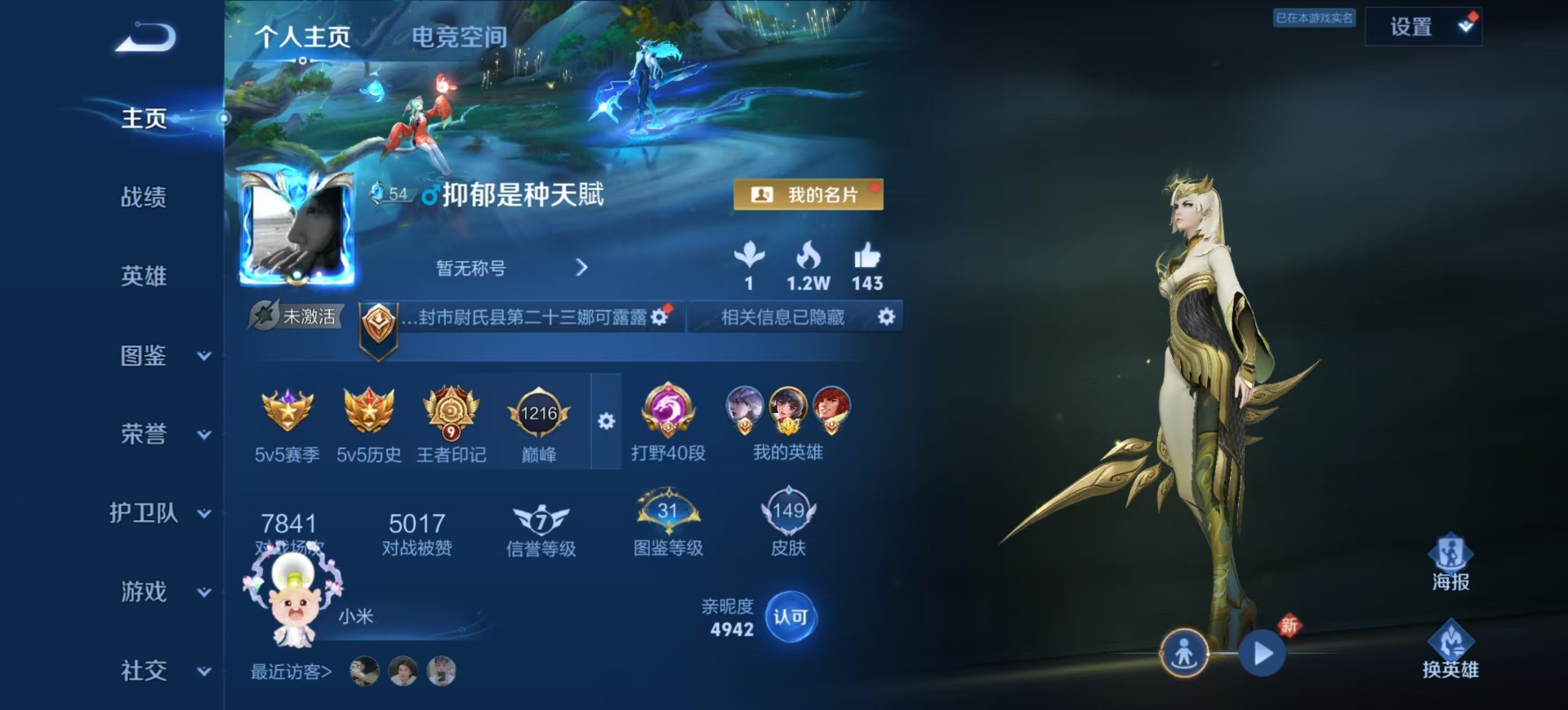 - PX_2102270-贵族等级: V4 英雄数: 60 皮肤数: 43 传说皮: 记忆之芯 限定皮: 鸣野蒿