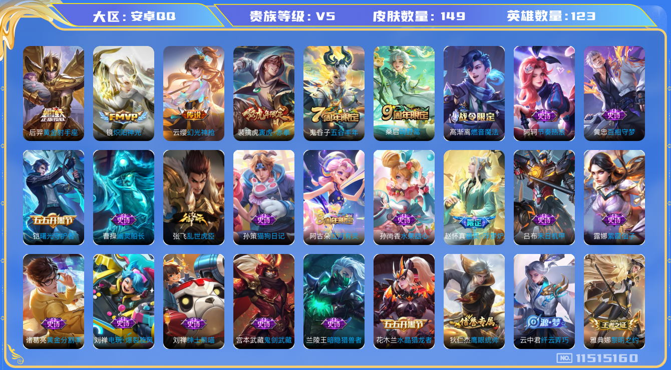 [11515160]V5 5传说 123英雄 149皮肤 可修改实名 优质装备:黄金射手座,炽阳神光 传说皮:幻光神枪 珍宝阁皮:蔷薇恋人,女武神 限定皮:鸣野蒿,五谷丰年,寅虎·赤拳(老虎年限) 史诗皮:器灵·浮梦炉,百相守梦-黄忠,紫霞仙子,黄金分割率,电玩·爆裂旋风,江河有灵,高渐离燃音魔法,蒙恬荣光圣徽,晚萤,末日机甲-吕布,猫狗日记-孙策,乱世虎臣,节奏热浪,水果甜心,绅士熊喵,暗隐猎兽者,幽灵船长,鬼剑武藏,纤云弄巧,繁星吟游(呼啦呼啦),水晶猎龙者,曙光守护者,金属风暴,鹰眼统帅,魅力维加斯,黎明之约
