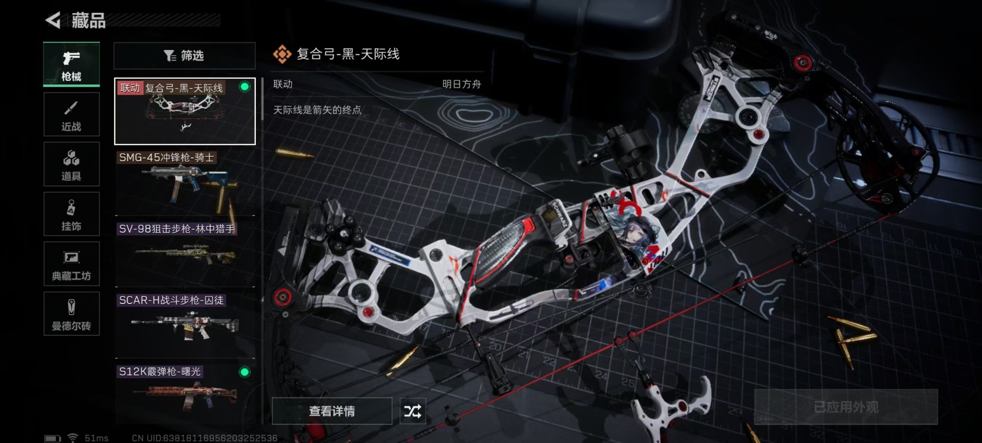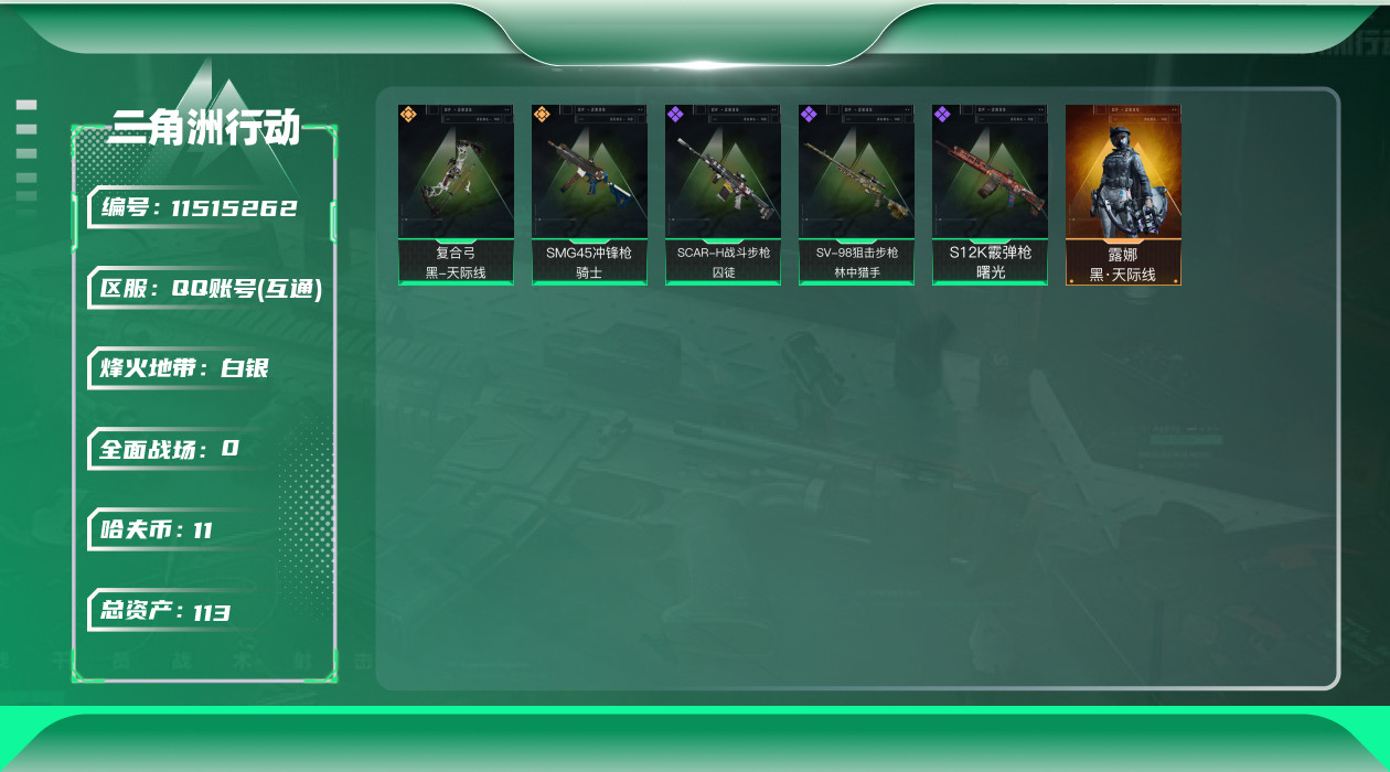 [11515262]可二次 可修改实名 实名:可修改 烽火地带段位:白银 全面战场段位:无段位 总资产:113.8 哈夫币:11.084 传说武器皮肤:SMG45冲锋枪-骑士,复合弓-黑-天际线 史诗武器皮肤:SV-98狙击步枪-林中猎手,SCAR-H战斗步枪-囚徒,S12K霰弹枪-曙光 干员外观:露娜-黑·天际线
