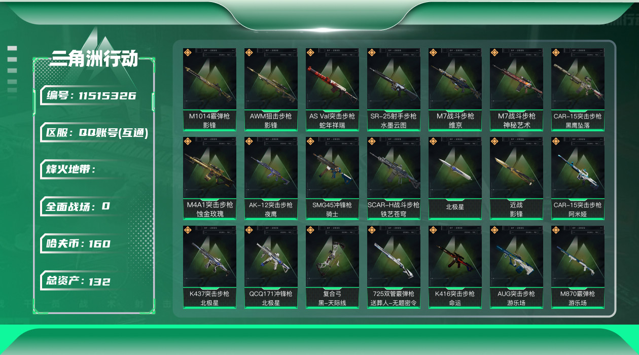 [11515326]可二次 可修改实名 实名:可修改 顶级安全箱(9.17到期) 总资产:132.8 哈夫币:160.524 传说武器皮肤:近战-影锋,近战-北极星,K416突击步枪-命运(典藏),AS Val突击步枪-蛇年祥瑞,SCAR-H战斗步枪-水墨云图,SR-25射手步枪-水墨云图,AWM狙击步枪-影锋,M1014霰弹枪-影锋,SCAR-H战斗步枪-铁艺苍穹,AK-12突击步枪-夜鹰,SMG45冲锋枪-骑士,复合弓-黑-天际线,CAR-15突击步枪-阿米娅,725双管霰弹枪-送葬人-无题密令,QCQ171冲锋枪-北极星,K437突击步枪-北极星,M870霰弹枪-游乐场,AUG突击步枪-游乐场,M7战斗步枪-维京,M4A1突击步枪-蚀金玫瑰,M7战斗步枪-神秘艺术,CAR-15突击步枪-黑鹰坠落 史诗武器皮肤:腾龙突击步枪-无垢,MP7冲锋枪-无垢 干员外观:红狼-蚀金玫瑰,骇爪-水墨云图,露娜-黑·天际线