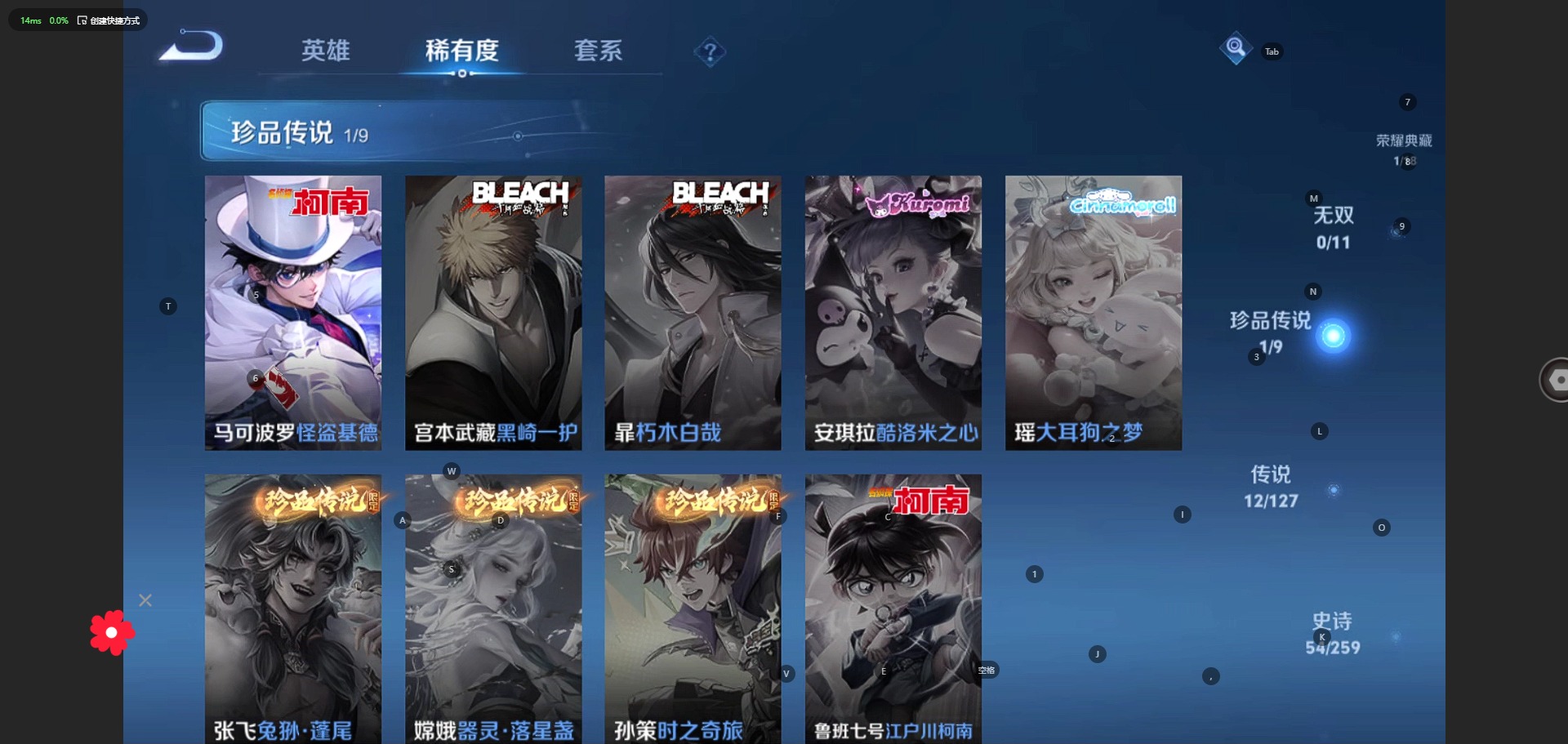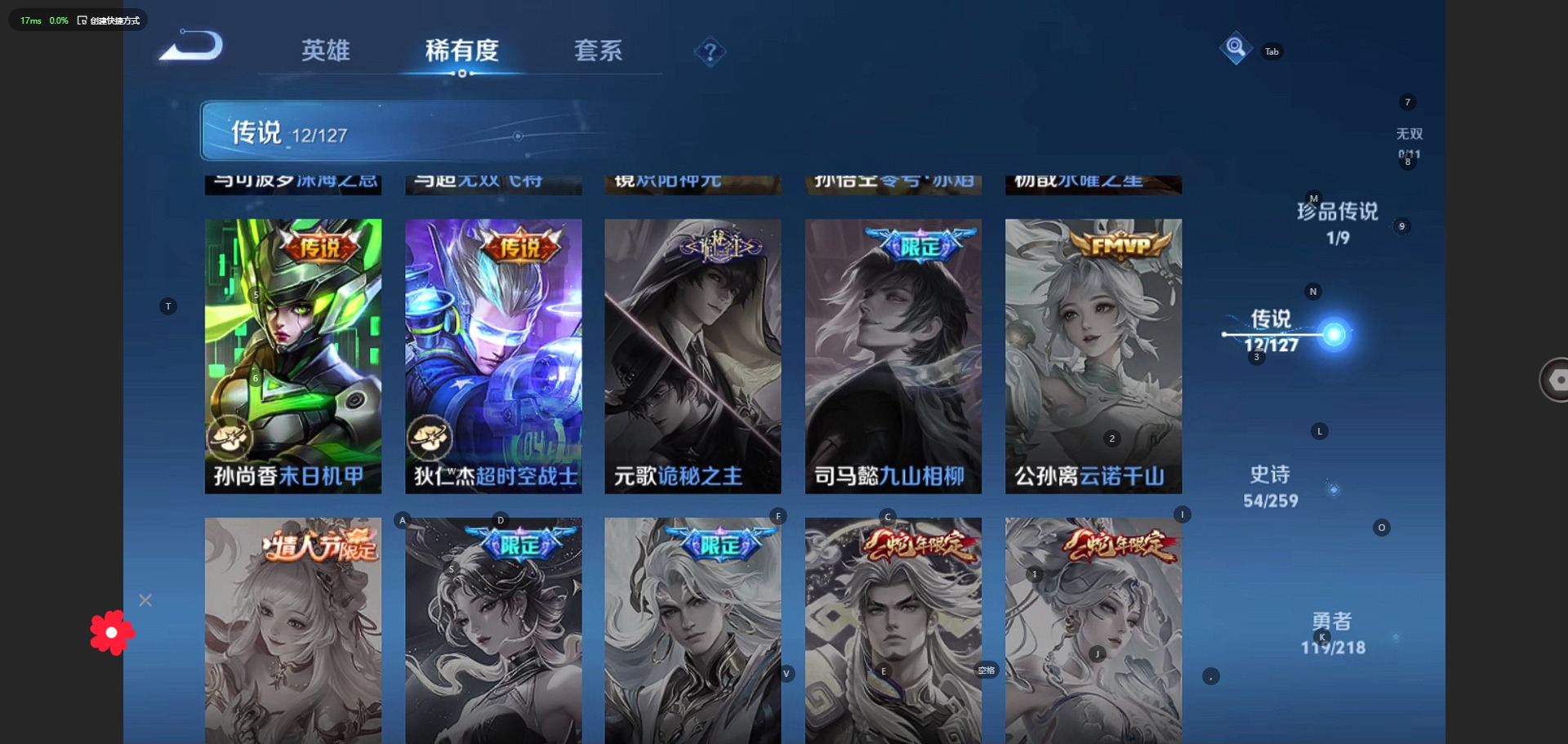 - PX_2099956-Q/至尊星耀/257皮肤/122英雄/0典藏/0珍品无双/0无双/0珍品传说/18传说/64史诗/7稀有英雄 【18 传说皮肤】胖达荣荣 梦奇,启明星使 虞姬,逐花归海 澜,无双飞将 马超,齐天大圣 孙悟空,猫影幻舞 貂蝉,地狱之眼 宫本武藏,炽阳神光 镜,黄金射手座 后羿,怒海麟威 吕布,黄金狮子座 达摩,久胜战神 干将莫邪,山海·炽霜斩 李信,一念神魔 李信,音你心动 小