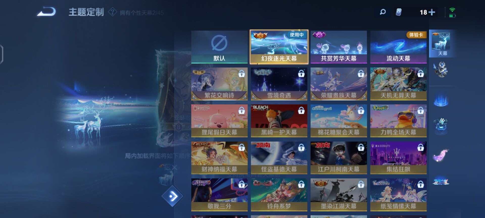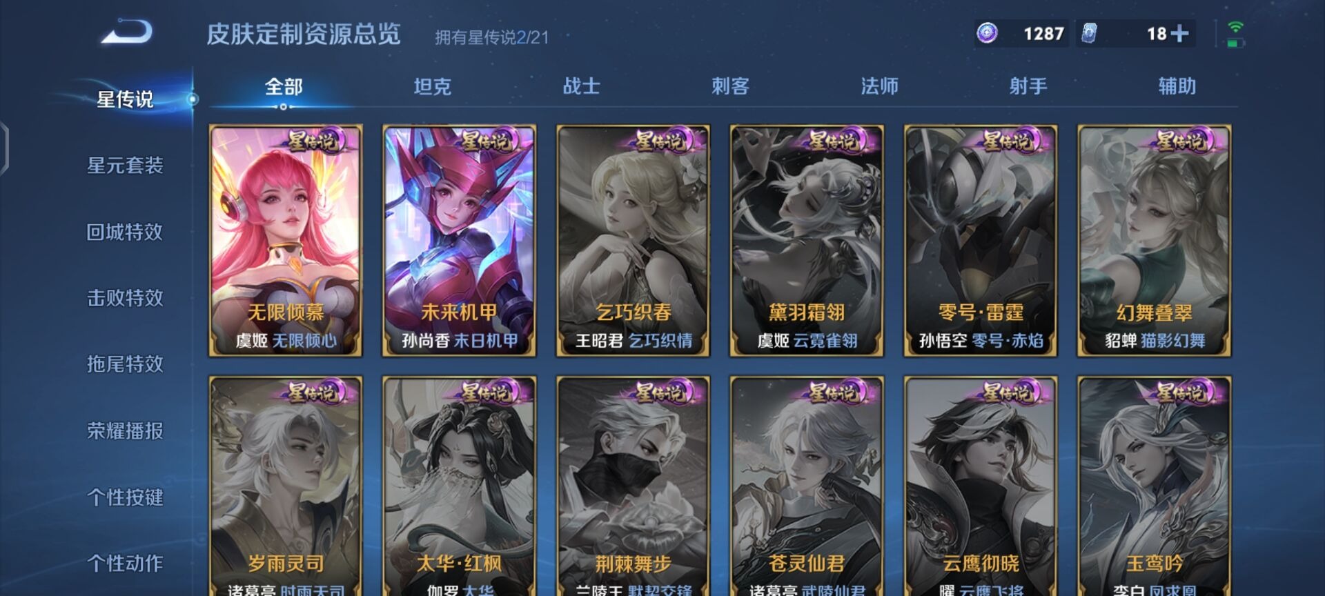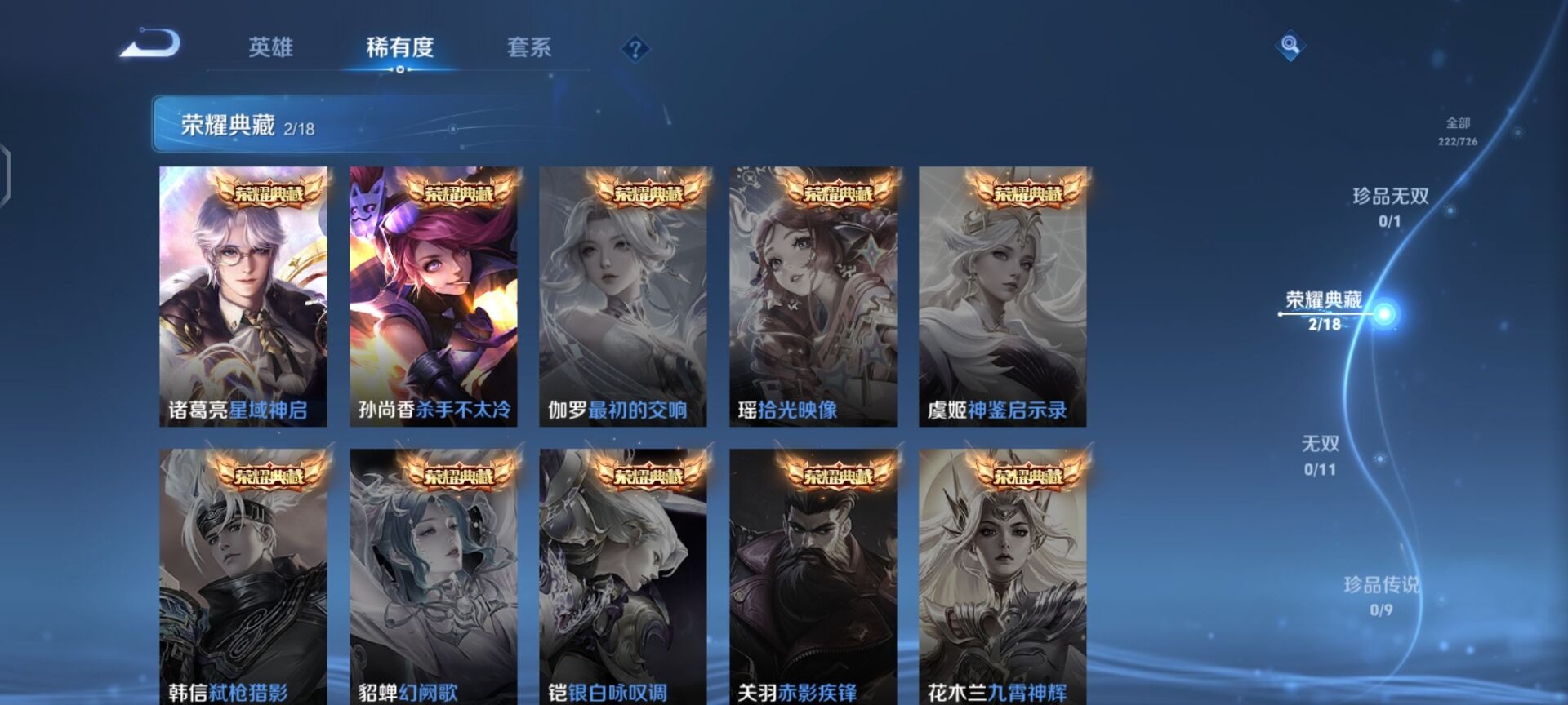 黄忠烈魂,伽罗天狼溯光者,伽罗太华,干将莫邪冰霜恋舞曲,孙尚香异界灵契,鲁班七号寅虎·瑞焰,后羿辉光之辰,诸葛亮时雨天司,裴擒虎李小龙,上官婉儿梁祝,花木兰瑞麟志,马可波罗山海·玄木吟,孙悟空至尊宝,百里守约朱雀志,虞姬霸王别姬