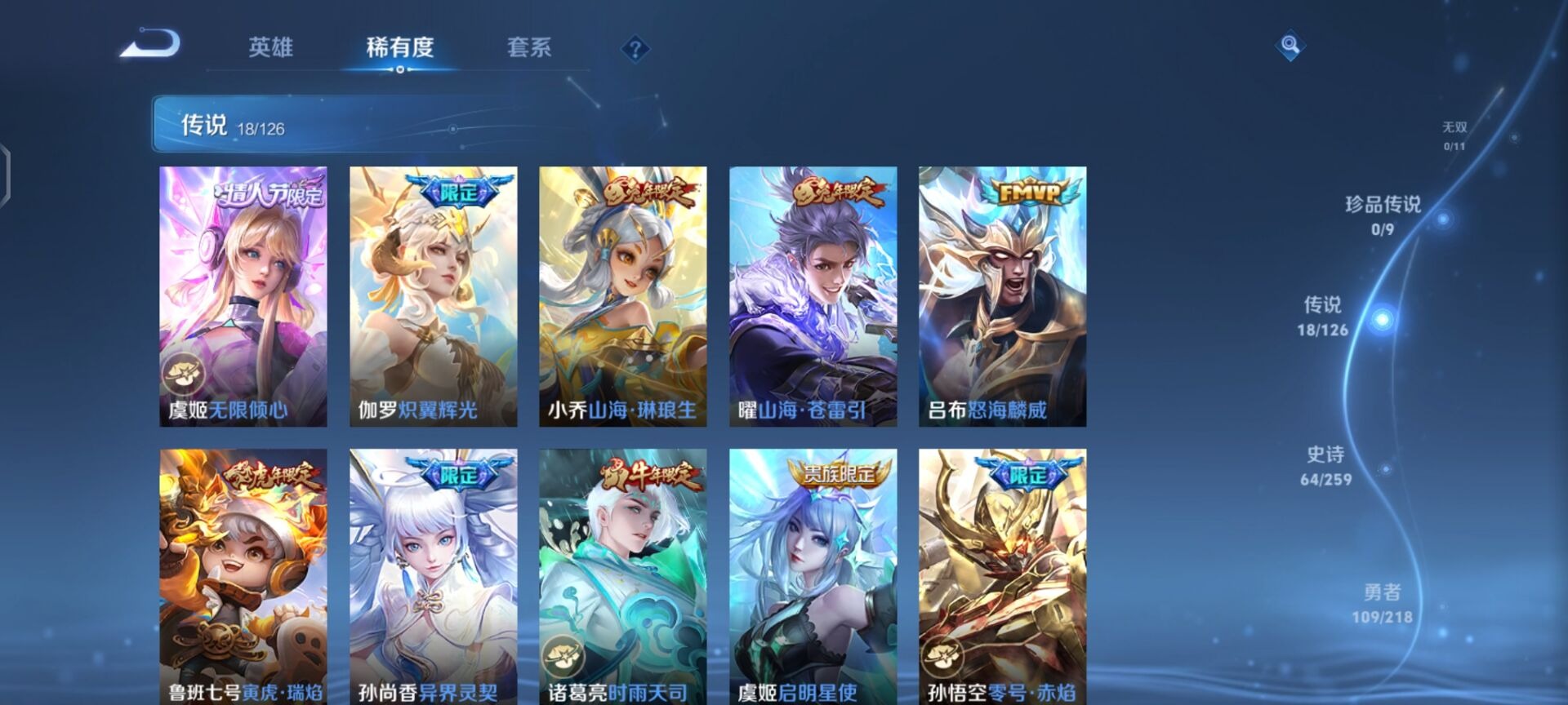 - [11846217]V9 2典藏 21传说 122英雄 308皮肤 典藏英雄武则天 可修改实名 优质装备:全息碎影(猴子典藏),九霄神辉(木兰典藏),黄金狮子座,黄金射手座,冠军飞将,一念神魔,云霓雀翎,末日机甲-孙尚香(绿蚂蚱),地狱火,仲夏夜之梦(大飞蛾),海洋之心,地狱之眼,淬星耀世,音你闪耀(rap皮) 珍宝阁皮:蔷薇恋人,女武神 限定皮:逐霄战戟,鸣野蒿,至尊宝,白虎志(电光耗子),凤求凰(白切鸡),太华(伽罗年限),梅西,武陵仙君(小桃花),傲雪梅枪,寅虎·展翼(孙膑年限),飞衡(韩信年限),瑞麟志(木兰年限),遇见飞天,高山流水,五谷丰年,青龙志(铠年限),冰锋战神,武圣,游园惊梦,梁祝,天狼狩猎者,逐梦之翼,逐梦之星,李小龙,逐梦之影,逐梦之光,孙行者,猪悟能,一生所爱,大圣娶亲,引擎之心,青春决赛季,冰霜恋舞曲,神奇女侠,美猴王,寅虎·御盾(廉颇年限),寅虎·瑞焰(虎皮蛋子),寅虎·心曲(虎婆),寅虎·赤拳(老虎年限),百木心枪,玉兔公主 史诗皮:紫霞仙子,白龙吟,黄金分割率,千年之狐,永昼,江河有灵,匿光侦查者,魅语,无限星赏官,冰冠公主,偶像歌手,晚萤,龙骑士(小龙虾),猫狗日记-孙策,猫狗日记-大乔,时之恋人-孙尚香,乱世虎臣,节奏热浪,修罗,摇滚巨星,水果甜心,天才门将,功夫厨神,德古拉伯爵,暗隐猎兽者,心灵战警,地狱岩魂,纤云弄巧,繁星吟游(呼啦呼啦),拒霜思,缤纷独角兽,乘风破浪,逐浪之夏,月团寄思,水晶猎龙者,曙光守护者,箭羽风息,唤灵魅影,金属风暴,原初追逐者,圣诞狂欢,圣诞恋歌,鹰眼统帅,暗夜贵公子,魅力维加斯,黎明之约,寅虎·御盾,未来纪元-赵云