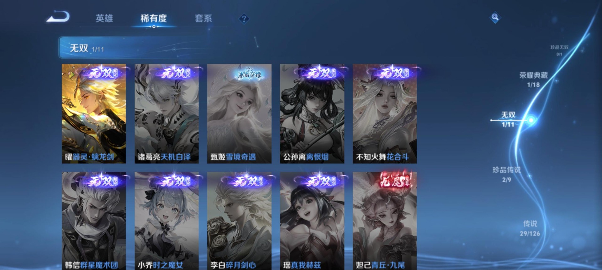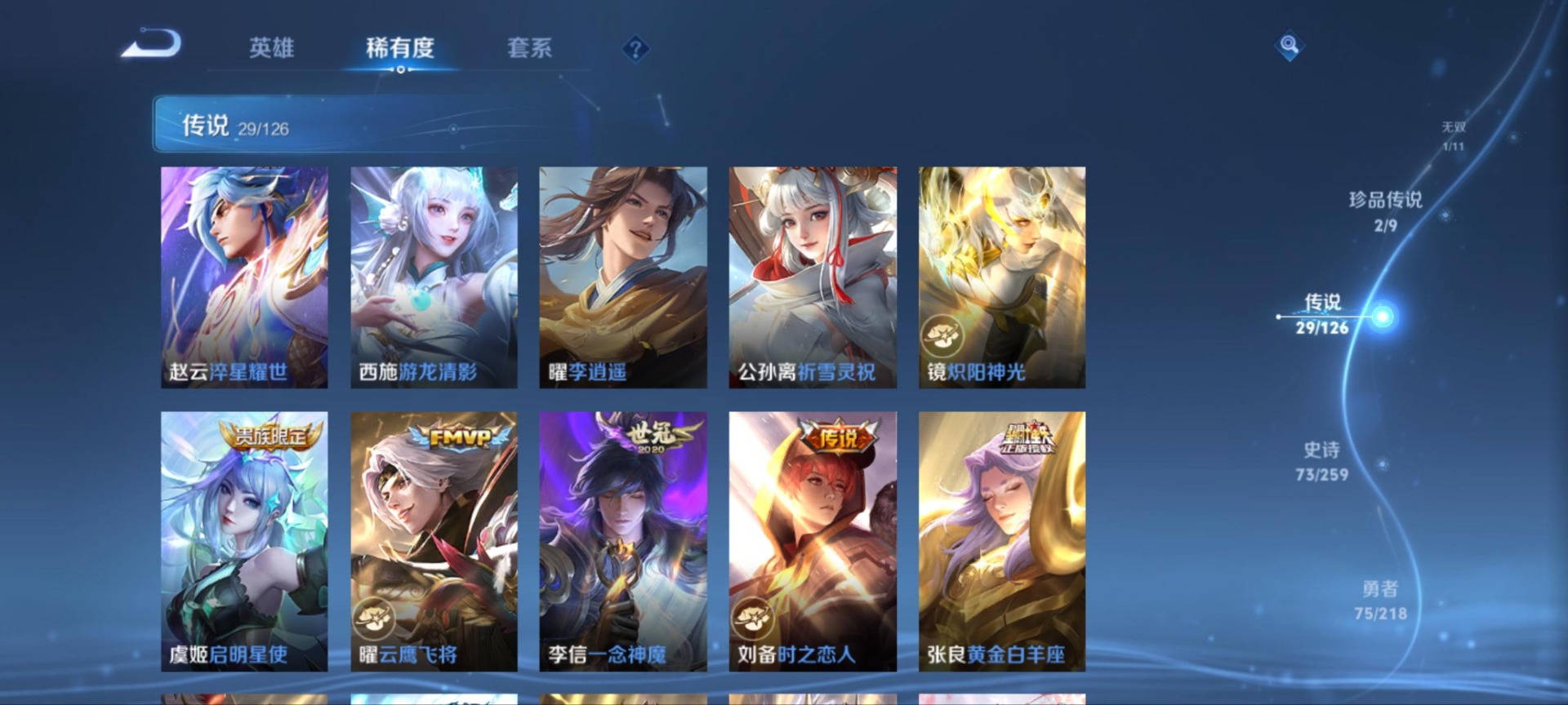 刘备时之恋人,赵云淬星耀世,干将莫邪久胜战神,李信一念神魔,孙策挚爱之约,达摩黄金狮子座,吕布遇见神鼓,镜炽阳神光,西施游龙清影,张良黄金白羊座,曜云鹰飞将,曜李逍遥,马超无双飞将,虞姬云霓雀翎