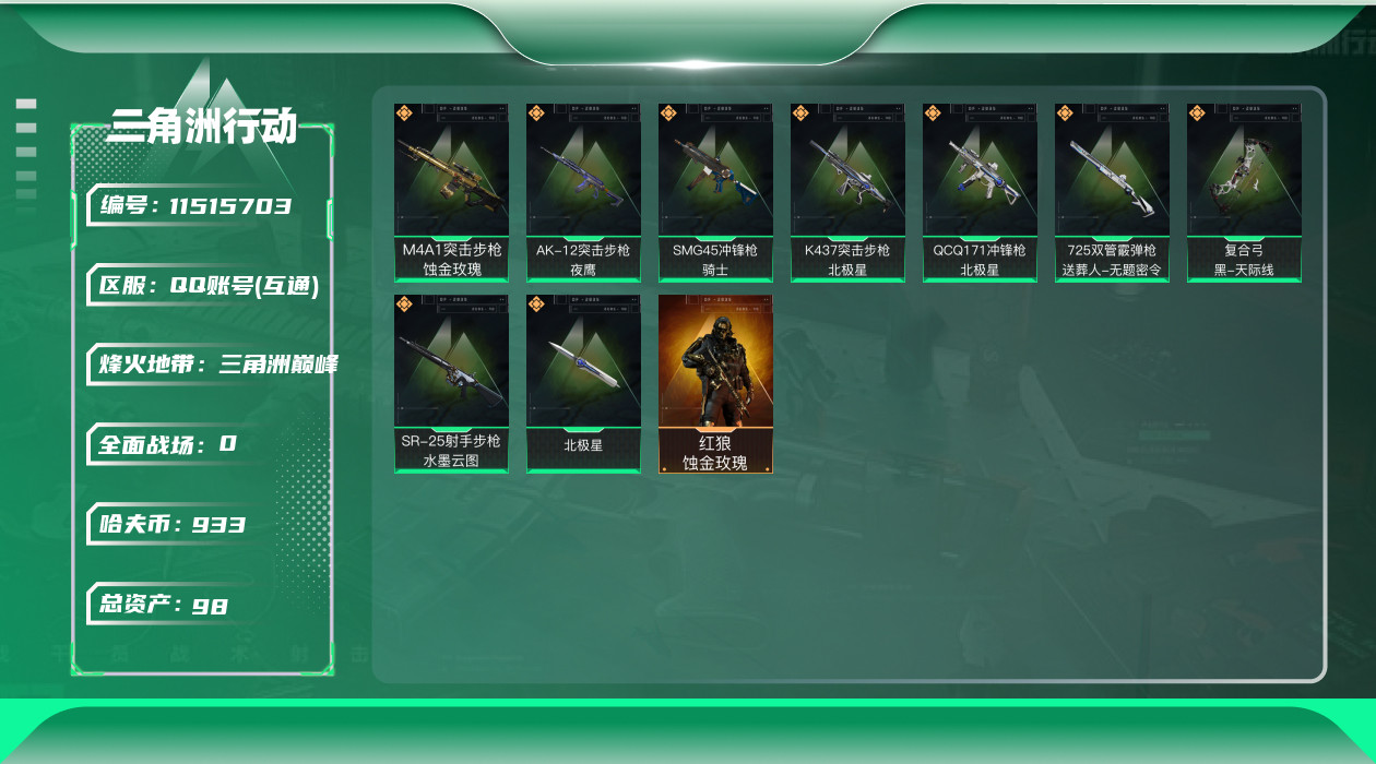 [11515703]总资产:98.2 1干员外观 1近战传说 9传说枪械 高级安全箱(2×3)9.15号到期 可二次 可修改实名 烽火地带段位:三角洲巅峰 全面战场段位:列兵 哈夫币:933.397 传说武器皮肤:近战-北极星,SR-25射手步枪-水墨云图,AK-12突击步枪-夜鹰,SMG45冲锋枪-骑士,复合弓-黑-天际线,725双管霰弹枪-送葬人-无题密令,QCQ171冲锋枪-北极星,K437突击步枪-北极星,M4A1突击步枪-蚀金玫瑰 干员外观:红狼-蚀金玫瑰