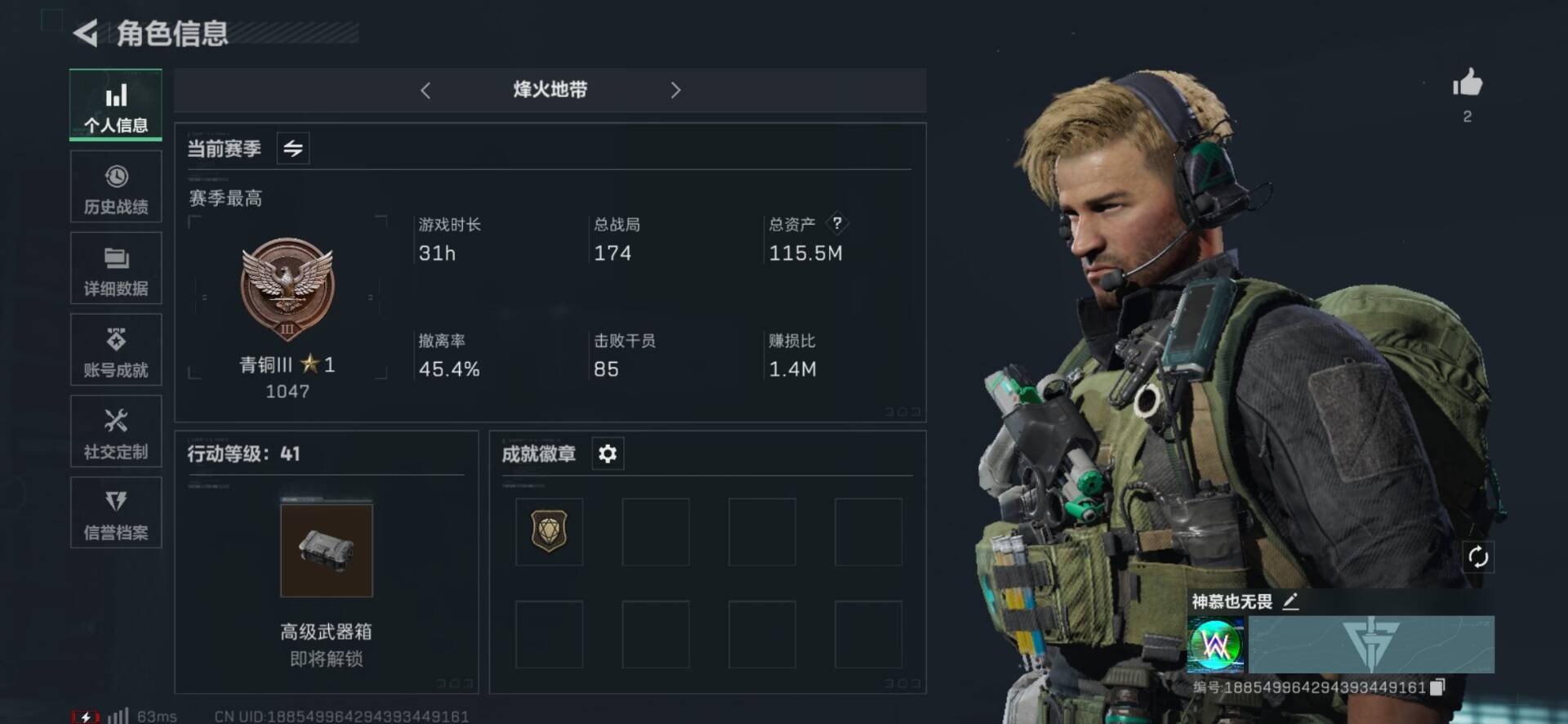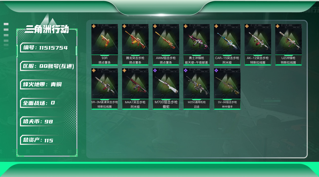 [11515754]总资产:115.5M 9传说枪械 哈夫币:98.503K 可二次 可修改实名 优质装备:非洲之心 烽火地带段位:青铜 全面战场段位:无段位 传说武器皮肤:M4A1突击步枪-阿米娅,CAR-15突击步枪-阿米娅,AWM狙击步枪-捞点薯条,腾龙突击步枪-捞点薯条,93R-捞点薯条,AK-12突击步枪-特斯拉线圈,SR-3M紧凑突击步枪-特斯拉线圈,UZI冲锋枪-特斯拉线圈,勇士冲锋枪-能天使-午夜邮差 史诗武器皮肤:M700狙击步枪-蝮蛇,SV-98狙击步枪-林中猎手,M250通用机枪-囚徒