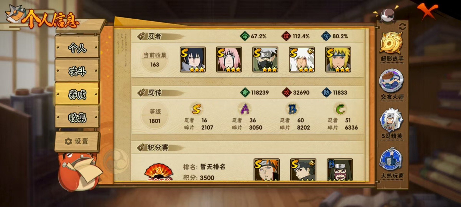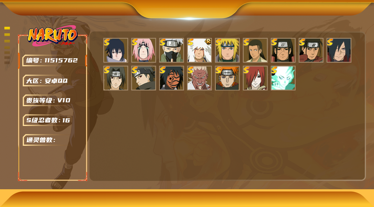 [11515762]V10 16S忍 36A忍 1088.2W战力 可二次 可修改实名 S级忍者:宇智波止水「须佐能乎」,艾「忍界大战」,宇智波斑「秽土转生·解」,千手柱间·木叶创立,宇智波佐助「永恒万花筒」,神秘面具男 「红夜之刃」,春野樱 「忍界大战」,千手柱间「秽土转生」,自来也 「舞之豪杰」,旗木卡卡西「须佐能乎」,大筒木舍人 「最终章」,长门「秽土转生」,千手柱间,宇智波鼬 「须佐能乎」,佩恩「天道」,波风水门