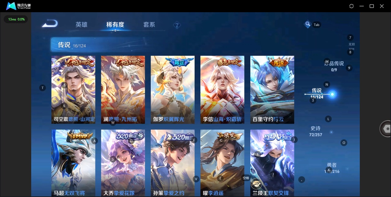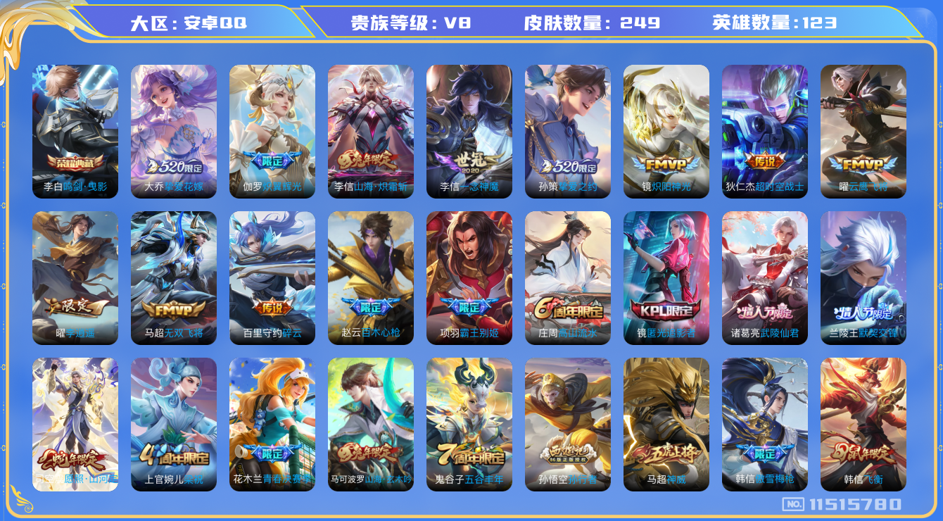 [11515780]V8 1典藏 16传说 123英雄 249皮肤 可修改实名 荣耀水晶:鸣剑·曳影 传说皮:李逍遥,山海·炽霜斩(李信年限),一念神魔,云鹰飞将(小将军),炽阳神光,无双飞将,超时空战士-狄仁杰,挚爱之约,挚爱花嫁,碎云,炽翼辉光(娃娃菜牛角包) 珍宝阁皮:妄想食味,玩趣恶龙 限定皮:愿照·九州拓(澜年限),愿照·山河定(司空震年限),武陵仙君(小桃花),傲雪梅枪,神威(电光马子),飞衡(韩信年限),高山流水,五谷丰年,梁祝,逐梦之影,霸王别姬-项羽,霸王别姬-虞姬,默契交锋-兰陵王,孙行者,青春决赛季,匿光追影者,百木心枪,山海·玄木吟(马可年限) 史诗皮:龙之律动,化蝶舞,白龙吟,千年之狐,永昼,百解令(蒙犽),蒙恬荣光圣徽,偶像歌手,晚萤,无限星赏官,魅语,末日机甲-吕布,猫狗日记-孙策,时之恋人-孙尚香,乱世虎臣,节奏热浪,修罗,女仆咖啡,水果甜心,绅士熊喵,星夜王子,德古拉伯爵,暗隐猎兽者,幽灵船长,鬼剑武藏,地狱岩魂,拒霜思,乘风破浪,逐浪之夏,热力回旋,箭羽风息,唤灵魅影,金属风暴,圣诞恋歌,鹰眼统帅,暗夜贵公子,魅力维加斯,黎明之约,赏金猎手,无心,未来纪元-赵云,玫瑰异探
