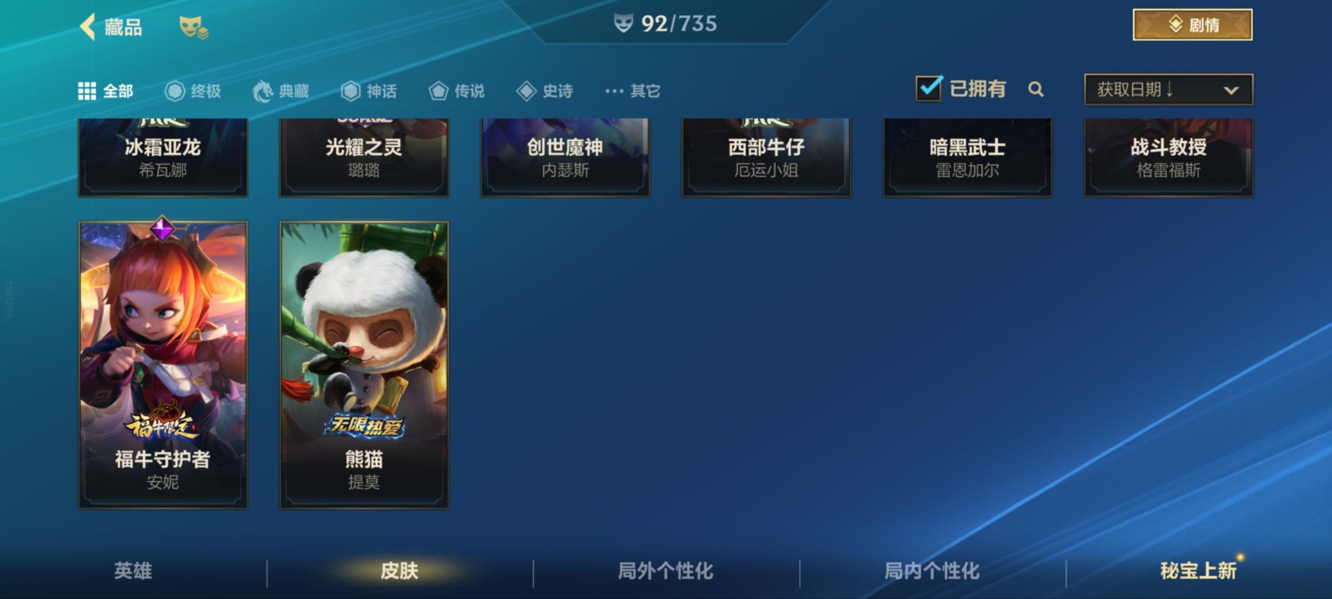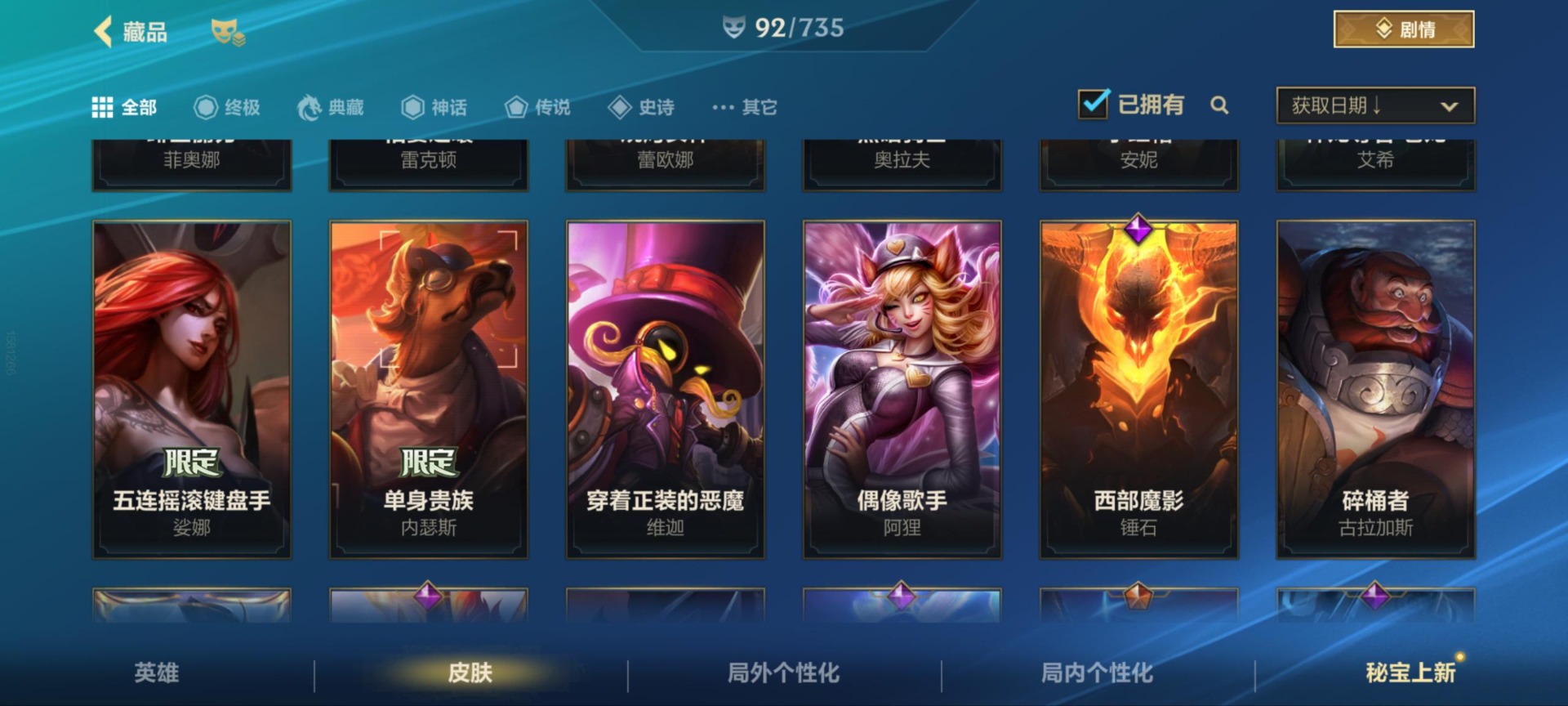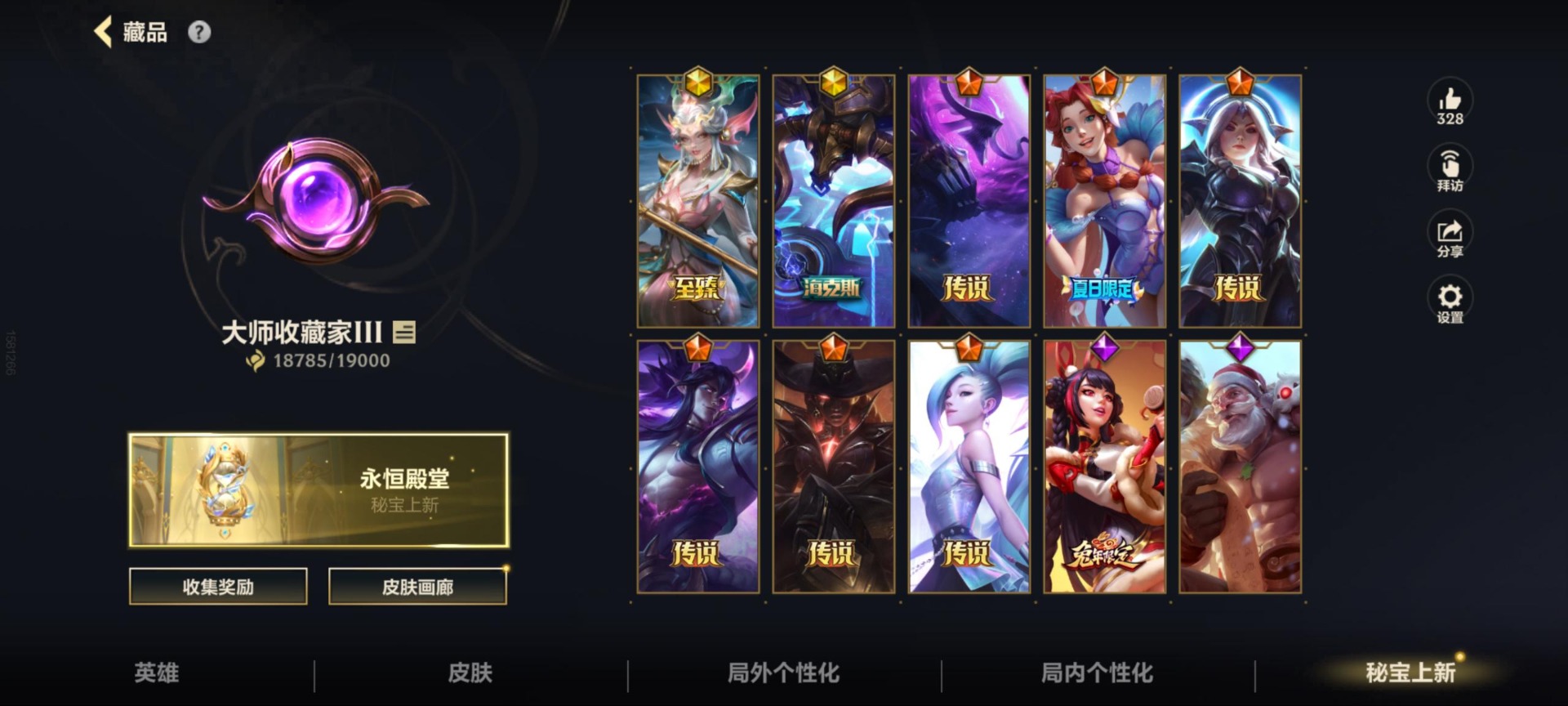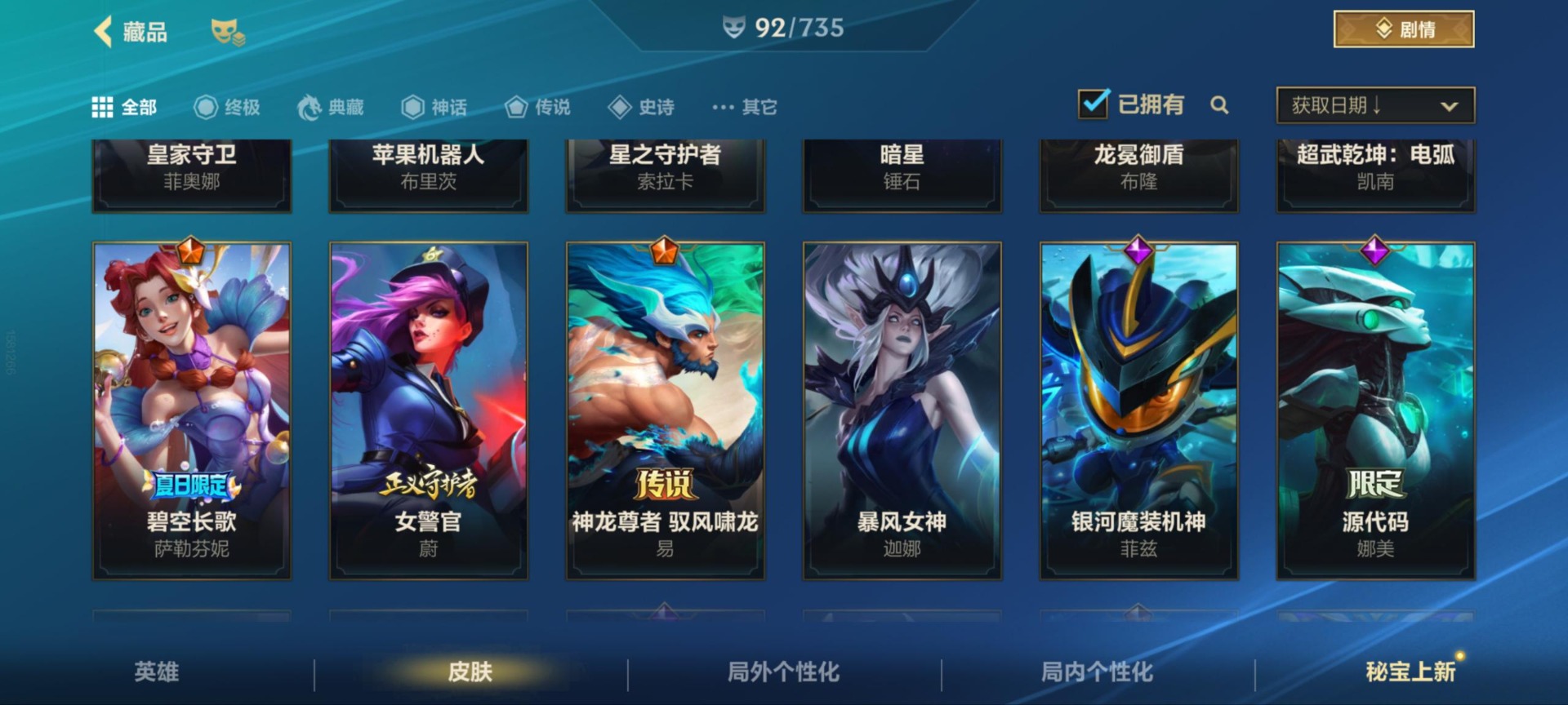 - PX_2072991-贵族等级: V7 英雄数: 114 皮肤数: 112 荣耀水晶: 最初的交响 无双皮: 雪境奇遇-甄姬 珍品传说: 时之奇旅-孙策,器灵·落星盏 传说皮: 铠冥王哈迪斯,幻光神枪 限定皮: 降魔,鸣野蒿,陌上桑,逐霄战戟,愿照·岁时盈,愿照·福禄聚