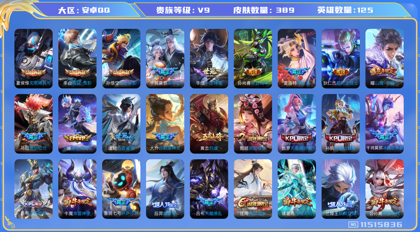 [11515836]V9 3典藏 15传说 125英雄 389皮肤 可修改实名 优质装备:无限飓风号(高达),鸣剑·曳影,全息碎影(猴子典藏),一念神魔,云霓雀翎,末日机甲-孙尚香(绿蚂蚱),超时空战士-狄仁杰,山海·苍雷引(电光曜子),画中仙,浮生妄,澜逐花归海,琥珀纪元马超,涂山容容 珍宝阁皮:妄想食味,女武神,玩趣恶龙 限定皮:逐霄战戟,鸣野蒿,至尊宝,傲雪梅枪,白鹤梁神女,白晶晶,时雨天司(水龙头),高山流水,五谷丰年,天狼运算者,游园惊梦,梁祝,烈魂,天狼溯光者,逐梦之音,奔雷神使(牛魔年限),祈雪灵祝(雪兔子),李小龙,逐梦之光,朱雀志(守约年限),如梦令-后羿,默契交锋-兰陵王,默契交锋-花木兰,孙行者,猪悟能,天魔缭乱,冰霜恋舞曲,乒乒小将,山海·玄木吟(马可年限) 史诗皮:鸭鸭历险记-刘禅,化蝶舞,灵蛊蚀心,龙之律动,石田雨龙,茶境仙,海诺心动手记,琥珀纪元伽罗,紫霞仙子,苍穹之光,电玩小子(小书包),黄金分割率,特工魅影,千年之狐,江河有灵,末日机甲-莱西奥,真我赫兹(镜),魅语,百解令(蒙犽),高渐离燃音魔法,蒙恬荣光圣徽,冰冠公主,偶像歌手,晚萤,电玩·爆裂旋风,暗夜猫娘,龙骑士(小龙虾),末日机甲-吕布,猫狗日记-孙策,猫狗日记-大乔,乱世虎臣,节奏热浪,女仆咖啡,摇滚巨星,水果甜心,绅士熊喵,天才门将,星夜王子,心灵骇客,功夫厨神,德古拉伯爵,暗隐猎兽者,幽灵船长,鬼剑武藏,心灵战警,乐园奇幻夜,舞动绿茵,地狱岩魂,诗语江南,纤云弄巧,繁星吟游(呼啦呼啦),拒霜思,缤纷独角兽,乘风破浪,逐浪之夏,月团寄思,水晶猎龙者,曙光守护者,箭羽风息,金属风暴,原初追逐者,圣诞狂欢,圣诞恋歌,鹰眼统帅,魅力维加斯,黎明之约,无心,未来纪元-赵云