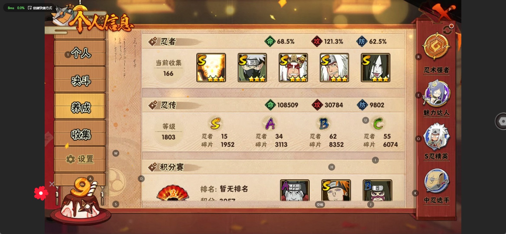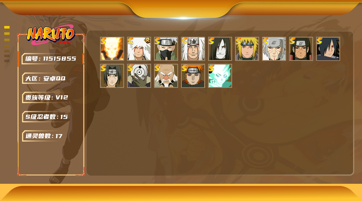 [11515855]V12 15S忍 24A忍 17通灵 890.1W战力 可二次 可修改实名 优质装备:熊猫,千手柱间「秽土转生」,宇智波斑 「木叶创立」,千手扉间「秽土转生」,“宇智波斑” 「白面具」,漩涡鸣人 「九喇嘛连结」,旗木卡卡西「须佐能乎」,大筒木舍人 「最终章」 S级忍者:大野木 「忍界大战」,自来也 「舞之豪杰」,宇智波鼬 「须佐能乎」,佩恩「天道」,波风水门,大蛇丸,自来也