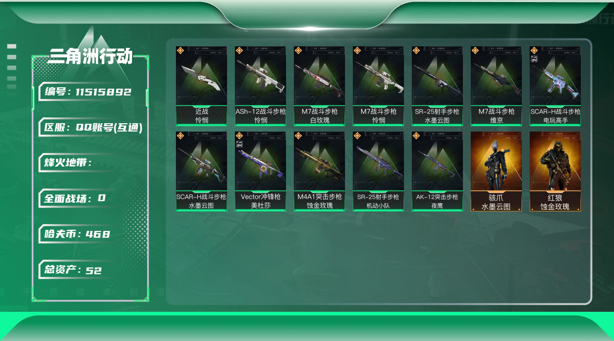 [11515892]可二次 可修改实名 实名:可修改 总资产:52.1 哈夫币:468.303 传说武器皮肤:近战-怜悯,Vector冲锋枪-美杜莎,SCAR-H战斗步枪-电玩高手,SCAR-H战斗步枪-水墨云图,SR-25射手步枪-水墨云图,AK-12突击步枪-夜鹰,M4A1突击步枪-蚀金玫瑰,M7战斗步枪-维京,M7战斗步枪-怜悯,ASh-12战斗步枪-怜悯,M7战斗步枪-白玫瑰,M7战斗步枪-机动小队 干员外观:红狼-蚀金玫瑰,骇爪-水墨云图