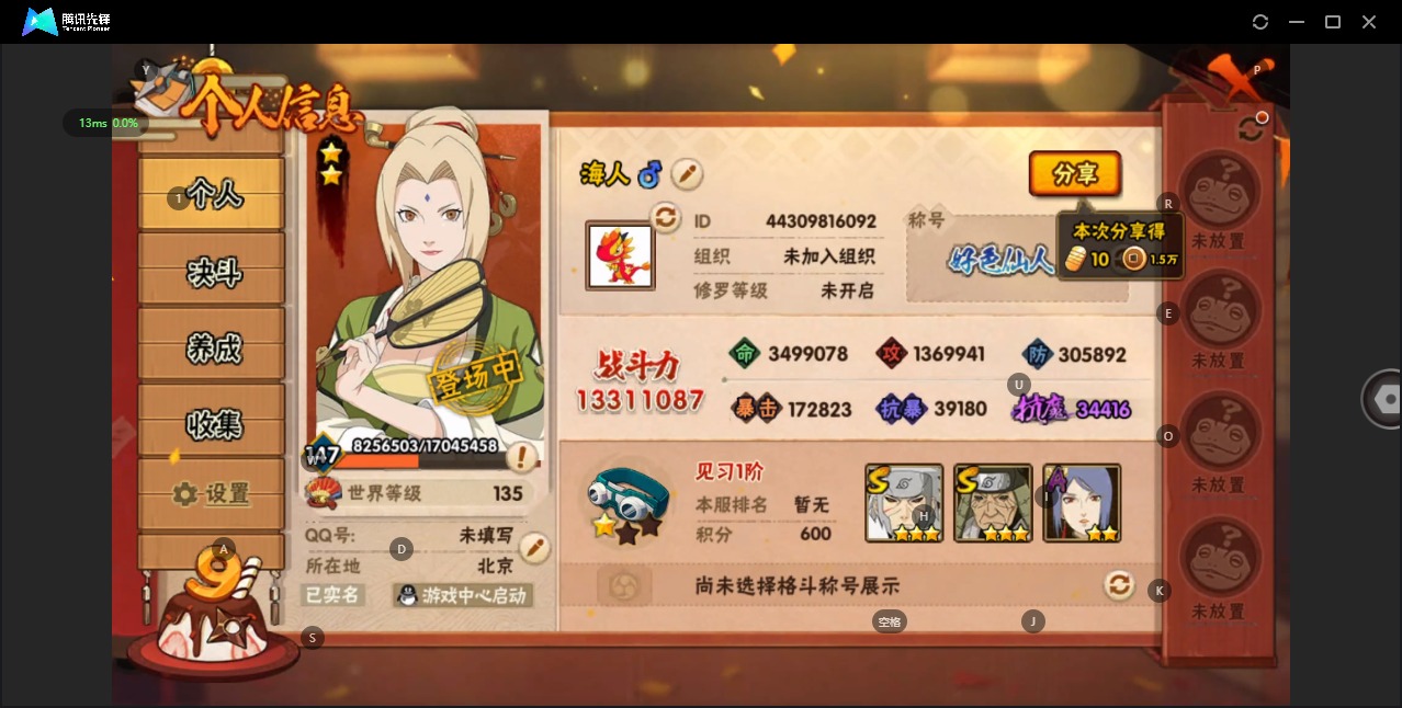 [11515971]V12 23S忍 29A忍 1331.1W战力 可二次 可修改实名 S级忍者:宇智波止水「须佐能乎」,艾「忍界大战」,大筒木桃式,宇智波斑「秽土转生·解」,千手柱间·木叶创立,宇智波佐助「永恒万花筒」,神秘面具男 「红夜之刃」,春野樱 「忍界大战」,大筒木金式「博人传」,漩涡鸣人 「九喇嘛连结」,大野木 「忍界大战」,自来也 「舞之豪杰」,“宇智波斑” 「白面具」,千手扉间「秽土转生」,猿飞日斩「秽土转生」,自来也「仙人模式」,宇智波鼬 「须佐能乎」,佩恩「天道」,猿飞日斩,波风水门,大蛇丸,自来也,纲手
