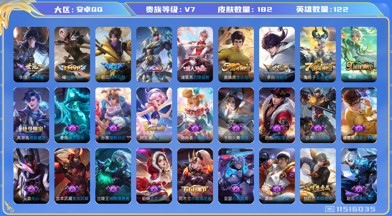 [11516035]V7 5传说 122英雄 182皮肤 可修改实名 优质装备:云鹰飞将(小将军),一念神魔 珍宝阁皮:蔷薇恋人,玩趣恶龙 限定皮:逐霄战戟,鸣野蒿,武陵仙君(小桃花),诗剑行,五谷丰年,李小龙,百木心枪 史诗皮:百相守梦-百里守约,黄金分割率,江河有灵,高渐离燃音魔法,魅语,末日机甲-吕布,猫狗日记-孙策,女仆咖啡,摇滚巨星,水果甜心,暗隐猎兽者,幽灵船长,鬼剑武藏,心灵战警,舞动绿茵,纤云弄巧,逐浪之夏,水晶猎龙者,金属风暴,圣诞狂欢,圣诞恋歌,鹰眼统帅,魅力维加斯,赏金猎手,无心,未来纪元-赵云