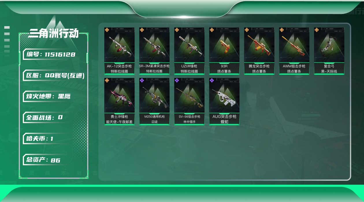 [11516128]总资产:86.2M 8传说枪械 哈夫币:1.003K 进阶安全箱(9.17到期) 可二次 可修改实名 烽火地带段位:黑鹰 全面战场段位:军士长 传说武器皮肤:复合弓-黑-天际线,AWM狙击步枪-捞点薯条,腾龙突击步枪-捞点薯条,93R-捞点薯条,AK-12突击步枪-特斯拉线圈,SR-3M紧凑突击步枪-特斯拉线圈,UZI冲锋枪-特斯拉线圈,勇士冲锋枪-能天使-午夜邮差 史诗武器皮肤:AUG突击步枪-蝮蛇,SV-98狙击步枪-林中猎手,M250通用机枪-囚徒