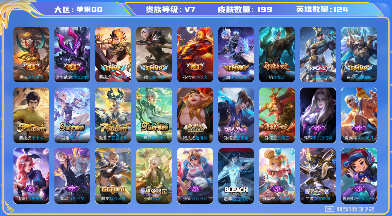 [11516372]V7 8传说 124英雄 199皮肤 可修改实名 女号 优质装备:云鹰飞将(小将军),地狱火,地狱之眼,澜逐花归海 传说皮:典韦战鼓燎原,祥瑞亨通 珍宝阁皮:胡桃夹子,玩趣恶龙 限定皮:逐霄战戟,陌上桑,鸣野蒿,至尊宝,怒海麟威,五谷丰年,青龙志(铠年限),李小龙,猪悟能,美猴王 史诗皮:鸭鸭历险记-刘禅,星界战将,龙之律动,石田雨龙,茶境仙,破空之剑,百相守梦-百里守约,百相守梦-黄忠,紫霞仙子,电玩小子(小书包),特工魅影,千年之狐,末日机甲-莱西奥,百解令(蒙犽),冰冠公主,猫狗日记-孙策,节奏热浪,女仆咖啡,摇滚巨星,水果甜心,星夜王子,功夫厨神,德古拉伯爵,暗隐猎兽者,鬼剑武藏,舞动绿茵,纤云弄巧,乘风破浪,热力回旋,箭羽风息,金属风暴,圣诞狂欢,圣诞恋歌,鹰眼统帅,魅力维加斯,未来纪元-赵云