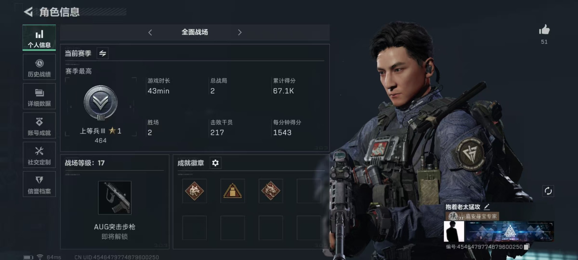 [11516358]总资产:201.4 2干员外观 1近战传说 2传说枪械 可二次 可修改实名 优质装备:近战-北极星 烽火地带段位:黑鹰 全面战场段位:上等兵 哈夫币:17.708 传说武器皮肤:M4A1突击步枪-蚀金玫瑰 史诗武器皮肤:M4A1突击步枪-特勤执行 干员外观:红狼-蚀金玫瑰,露娜-黑·天际线