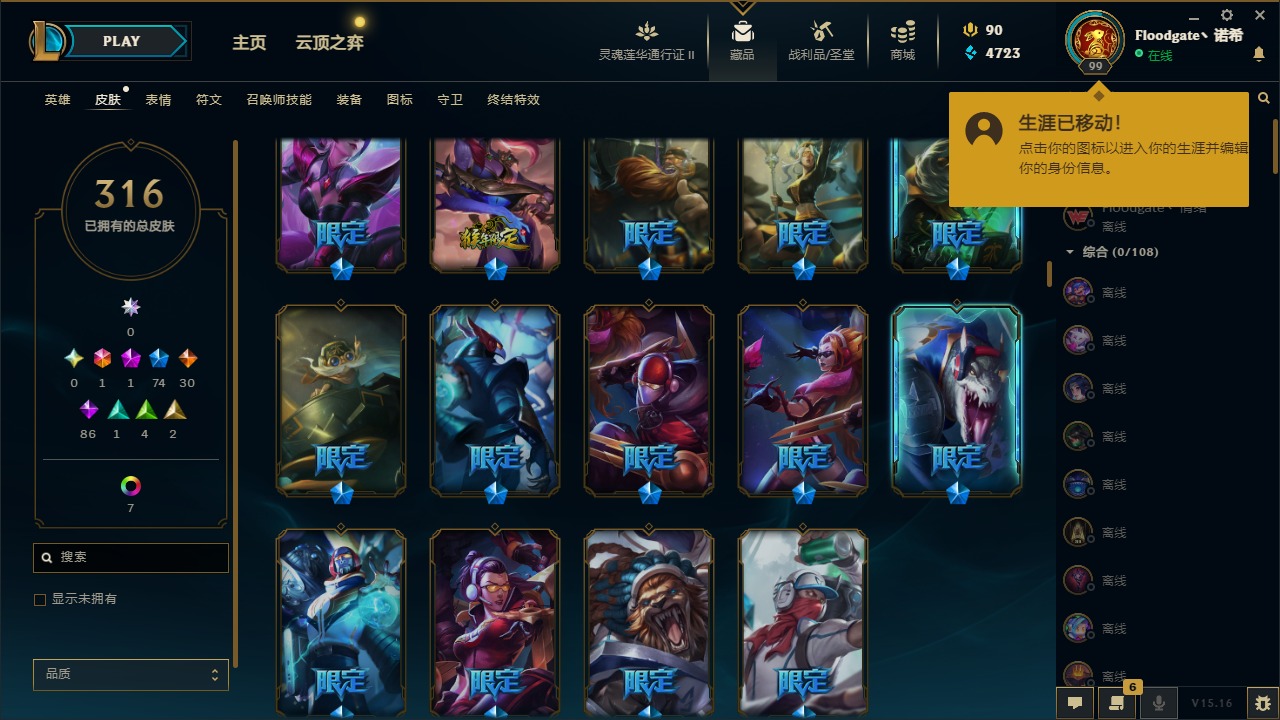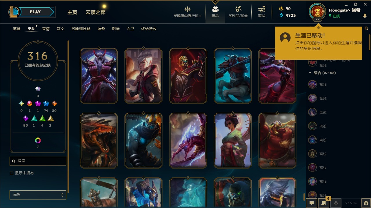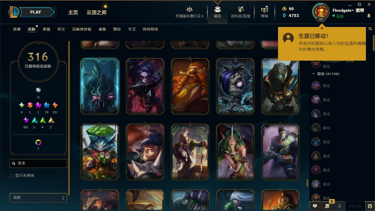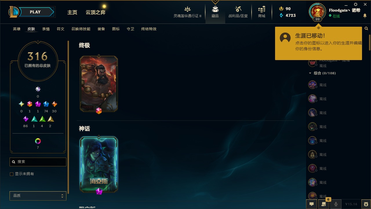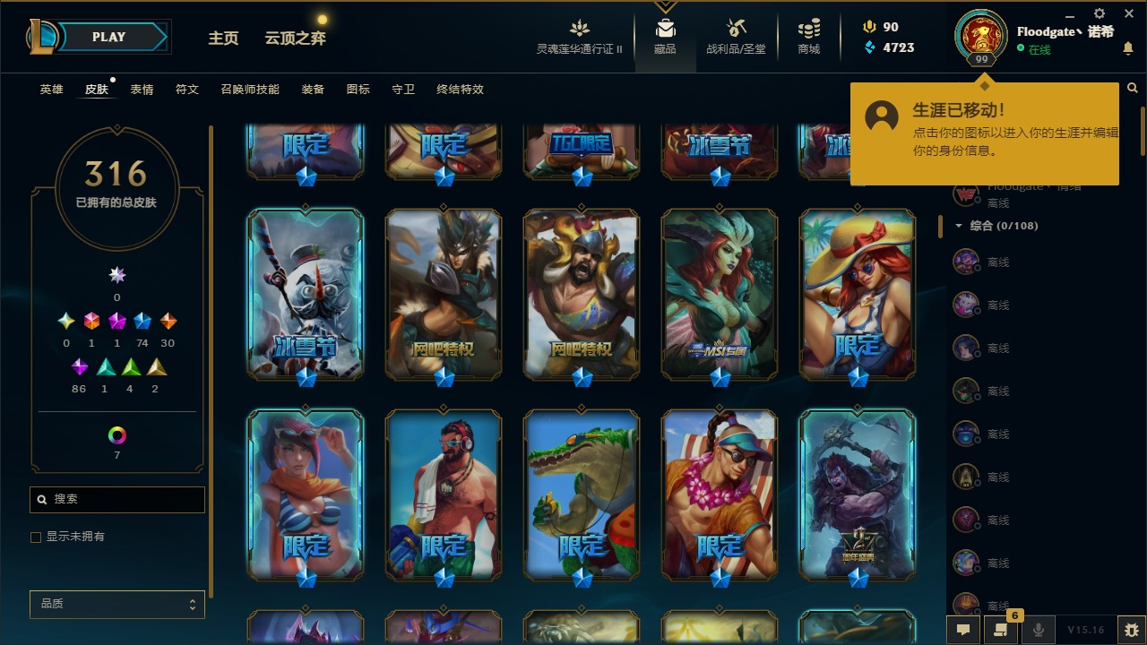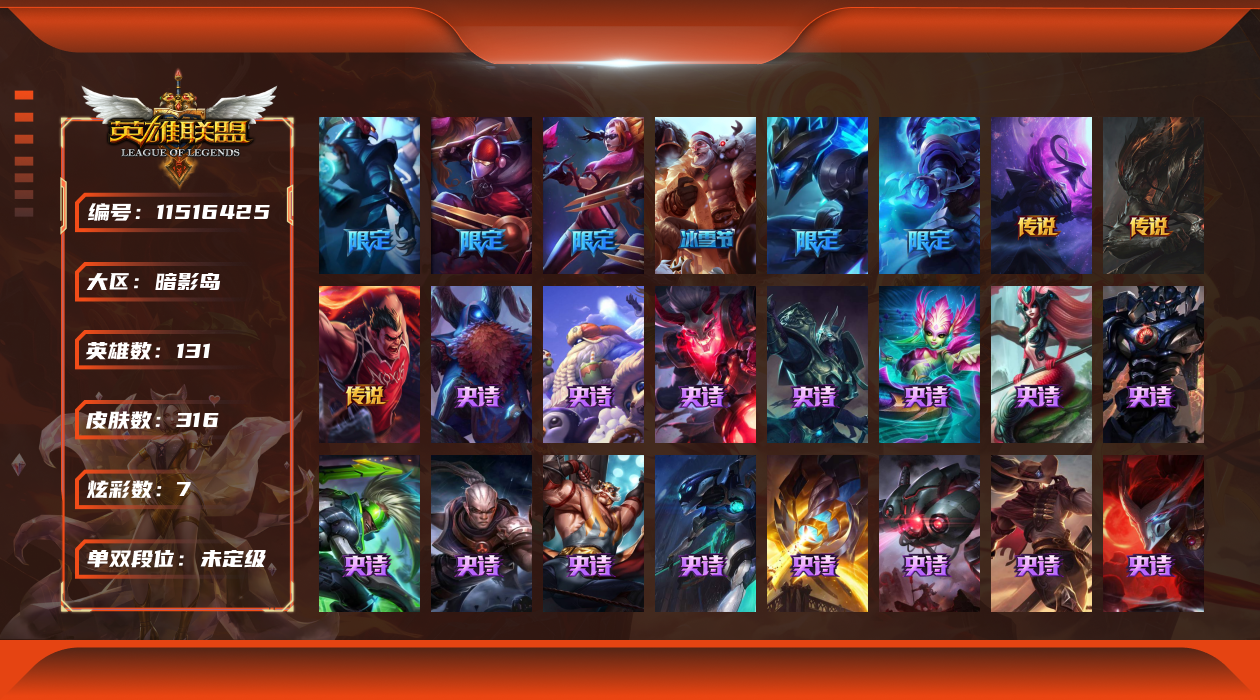 [11516425]可二次 可修改实名 1终极 1神话 74限定 30传说 86史诗 316皮肤 7炫彩 131英雄 皮肤:冰雪游神 巴德,永恒之森 巴德,冠军之矛 卡莉丝塔,暗星 锤石,腥红之月 锤石,冠军典狱长 锤石,深渊恐惧 锤石,SKT T1 阿兹尔,幽冥领主 阿兹尔,海皇姬 娜美,河水之灵 娜美,锦鲤 娜美,胜利之剑 亚托克斯,狂鲨 亚托克斯,霸天剑魔 亚托克斯,源计划:裁决 蔚,源计划:自由 艾克,任性学霸 艾克,SKT T1 劫,职业杀手 卢锡安,海牛大大 塔姆,神龙烈焰 金克丝,圣诞老人 布隆,布隆·狮心,猛虎 布隆,源代码 卡蜜尔,苍穹之光 维克兹,战地机甲 维克兹,黑夜使者 亚索,腥红之月 亚索,源计划:风 亚索,西部牛仔 亚索,邪恶魔人 扎克,SKT T1 婕拉,野火之藤 婕拉,冰雪女神 辛德拉,亚特兰蒂斯 辛德拉,死亡之鹰 奎因,勇敢的心 奎因,血石妖后 丽桑卓,天启骑士 杰斯,全金属狂潮 杰斯,热血班长 德莱厄斯,灌篮高手 德莱厄斯,勇敢的心 德莱厄斯,生化骑士 德莱厄斯