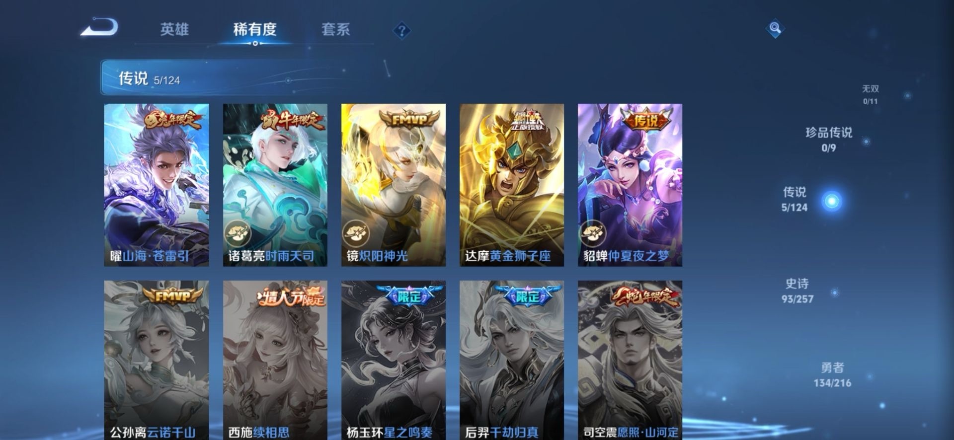 夏侯惇朔风刀,老夫子醍醐杖,沈梦溪大漠名商,盾山御銮,曹操烛龙,苏烈千军破阵,典韦穷奇,达摩沙漠行僧,牛魔御旌,元歌云间偶戏,兰陵王金庭之子,裴擒虎擒涛扼浪,鲁班大师探海日志,明世隐疑决卦,蒙犽狂想玩偶喵,马可波罗暗影游猎,白起狰,鬼谷子原初探秘者,张良古海寻踪,桑启海盐诗旅,狄仁杰万华元夜,芈月重明,程咬金演武夺筹,李元芳云中旅人,弈星混沌棋,钟馗驱傩正仪,狂铁御狮,太乙真人饕餮