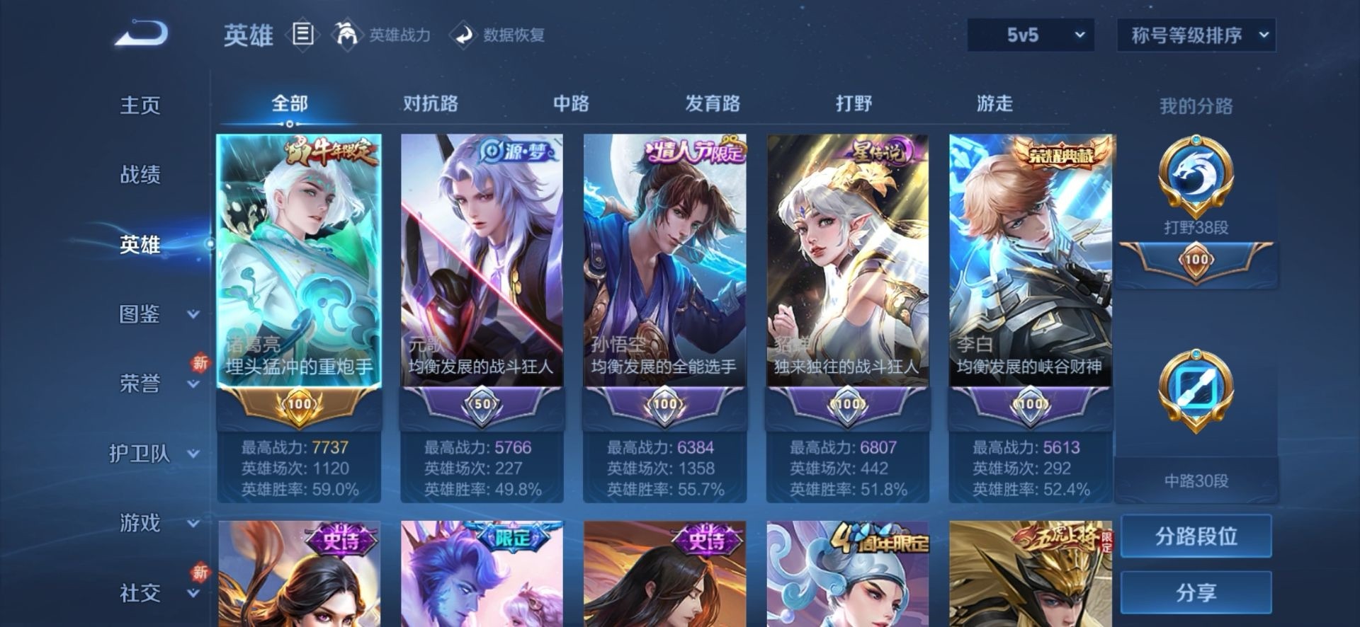 - [11972436]V8 2典藏 11传说 120英雄 171皮肤 可修改实名 优质装备:杀手不太冷,全息碎影(猴子典藏),黄金狮子座,冠军飞将,云鹰飞将(小将军),久胜战神,末日机甲-孙尚香(绿蚂蚱),地狱火,仲夏夜之梦(大飞蛾),地狱之眼,超时空战士-狄仁杰,涂山容容 珍宝阁皮:玩趣恶龙 限定皮:白虎志(电光耗子),神威(电光马子),瑞麟志(木兰年限),天狼绘梦者,朱雀志(守约年限),一生所爱,大圣娶亲,蜜橘之夏,神奇女侠 史诗皮:石田雨龙,紫霞仙子,白龙吟,黄金分割率,千年之狐,冰冠公主,偶像歌手,末日机甲-吕布,节奏热浪,女仆咖啡,水果甜心,星夜王子,德古拉伯爵,心灵战警,繁星吟游(呼啦呼啦),逐浪之夏,曙光守护者,原初追逐者,圣诞狂欢,鹰眼统帅,魅力维加斯,未来纪元-赵云