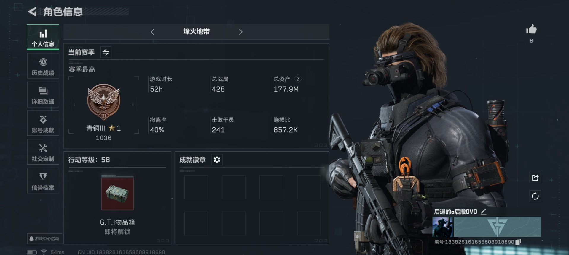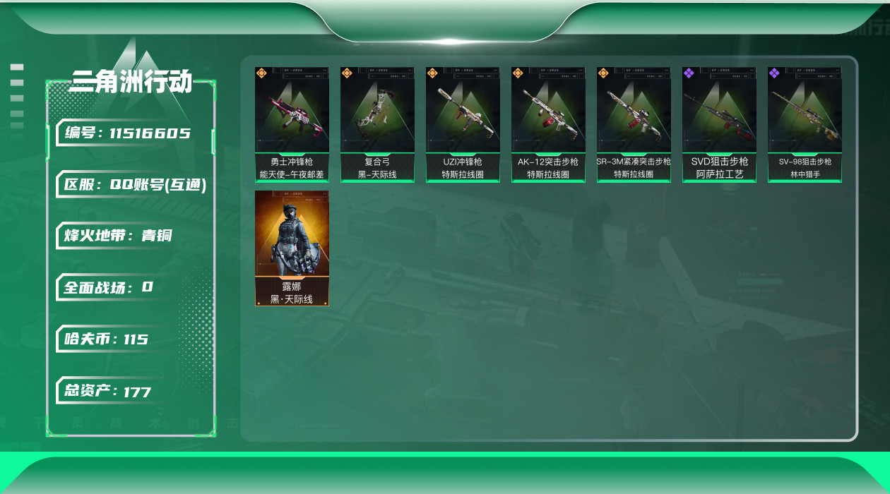 [11516605]总资产:177.9M 1干员外观 5传说枪械 哈夫币:115K 进阶安全箱(2×2)9.15号到期 可二次 可修改实名 烽火地带段位:青铜 全面战场段位:无段位 传说武器皮肤:复合弓-黑-天际线,AK-12突击步枪-特斯拉线圈,SR-3M紧凑突击步枪-特斯拉线圈,UZI冲锋枪-特斯拉线圈,勇士冲锋枪-能天使-午夜邮差 史诗武器皮肤:SV-98狙击步枪-林中猎手,SVD狙击步枪-阿萨拉工艺 干员外观:露娜-黑·天际线