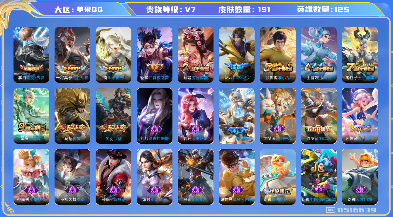 [11516639]V7 1典藏 5传说 125英雄 191皮肤 可修改实名 荣耀水晶:鸣剑·曳影 传说皮:仲夏夜之梦(大飞蛾),久胜战神,炽阳神光 珍宝阁皮:胡桃夹子,蔷薇恋人 限定皮:鸣野蒿,神威(电光马子),五谷丰年,武圣,游园惊梦,梁祝,李小龙,百木心枪 史诗皮:鸭鸭历险记-刘禅,龙之律动,雪豹·霜爪,藏狐·褐绒,紫霞仙子,白龙吟,黄金分割率,特工魅影,千年之狐,江河有灵,蒙恬荣光圣徽,冰冠公主,魅语,电玩·爆裂旋风,末日机甲-吕布,节奏热浪,修罗,摇滚巨星,水果甜心,天才门将,星夜王子,德古拉伯爵,鬼剑武藏,心灵战警,舞动绿茵,纤云弄巧,繁星吟游(呼啦呼啦),逐浪之夏,月团寄思,水晶猎龙者,箭羽风息,金属风暴,原初追逐者,圣诞狂欢,鹰眼统帅,魅力维加斯,黎明之约,赏金猎手,无心