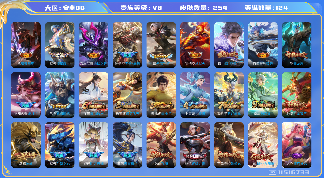 [11516733]V8 13传说 124英雄 254皮肤 可修改实名 传说皮:零号·赤焰,地狱火,地狱之眼,淬星耀世,云鹰飞将(小将军),绛天战甲(鸡嘴战神),碎云,山海·苍雷引(电光曜子) 珍宝阁皮:万物之道,蔷薇恋人,女武神,玩趣恶龙 限定皮:愿照·九州拓(澜年限),鸣野蒿,傲雪梅枪,绯月行,时之彼端,神威(电光马子),飞衡(韩信年限),遇见飞天,高山流水,怒海麟威,五谷丰年,青龙志(铠年限),梁祝,李小龙,逐梦之影,朱雀志(守约年限),引擎之心,美猴王 史诗皮:星界战将,器灵·浮梦炉,糖绘人间,石田雨龙,百相守梦-黄忠,蒙犽顽岩魄,化蝶舞,紫霞仙子,白龙吟,黄金分割率,特工魅影,江河有灵,百解令(蒙犽),蒙恬荣光圣徽,冰冠公主,电玩·爆裂旋风,龙骑士(小龙虾),末日机甲-吕布,猫狗日记-孙策,猫狗日记-大乔,时之恋人-孙尚香,乱世虎臣,节奏热浪,修罗,女仆咖啡,摇滚巨星,水果甜心,绅士熊喵,天才门将,星夜王子,心灵骇客,功夫厨神,德古拉伯爵,暗隐猎兽者,幽灵船长,鬼剑武藏,暗渊魔法,心灵战警,纤云弄巧,繁星吟游(呼啦呼啦),缤纷独角兽,乘风破浪,逐浪之夏,月团寄思,水晶猎龙者,曙光守护者,金属风暴,原初追逐者,圣诞恋歌,鹰眼统帅,魅力维加斯,黎明之约,无心,未来纪元-赵云,玫瑰异探
