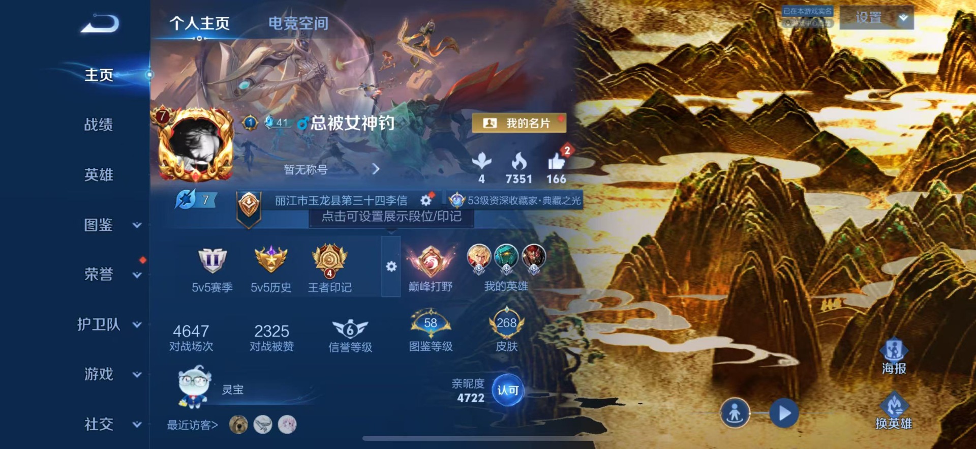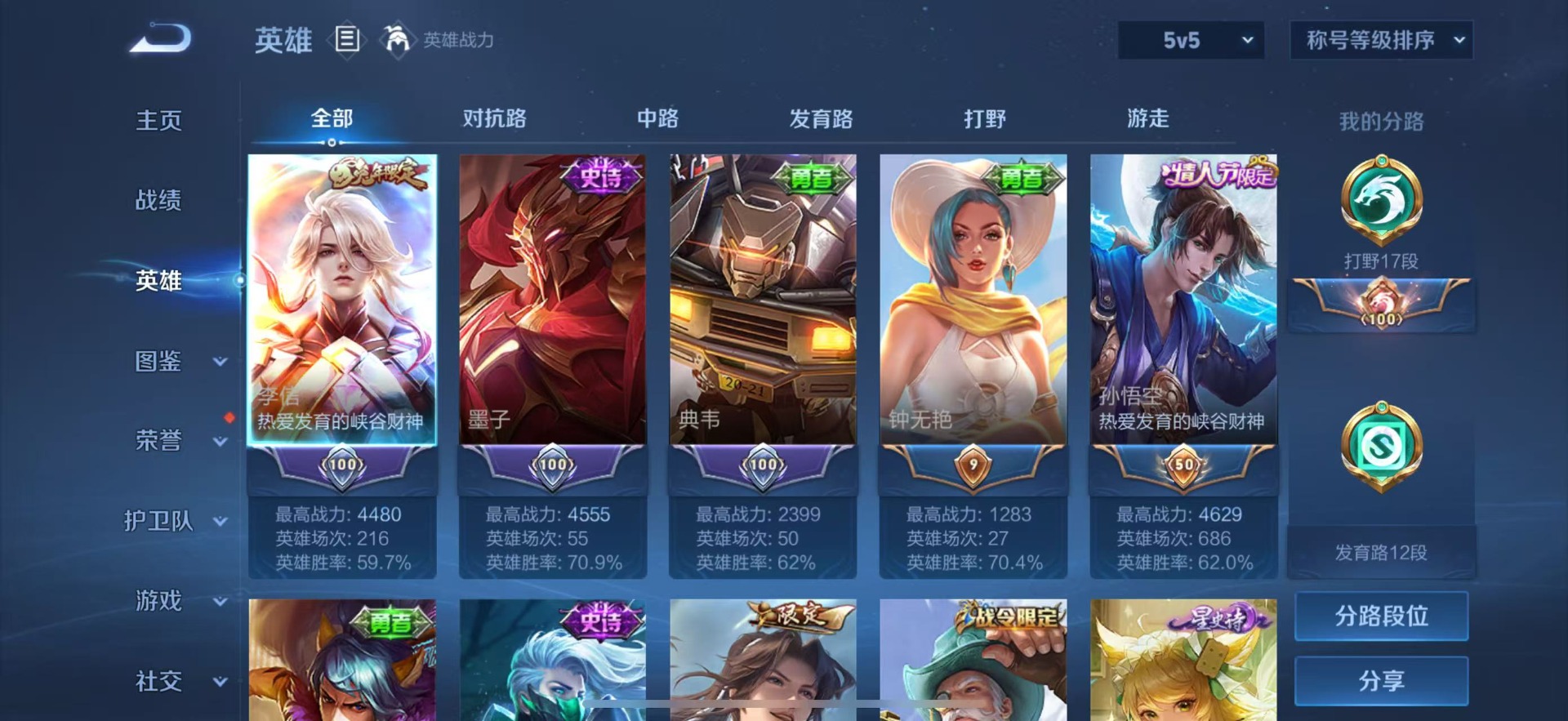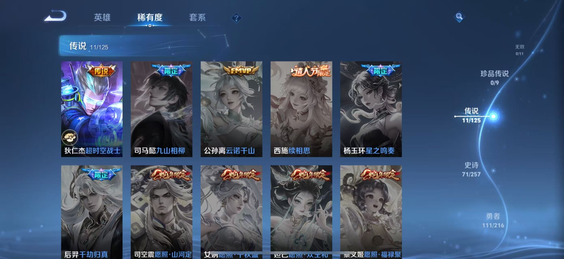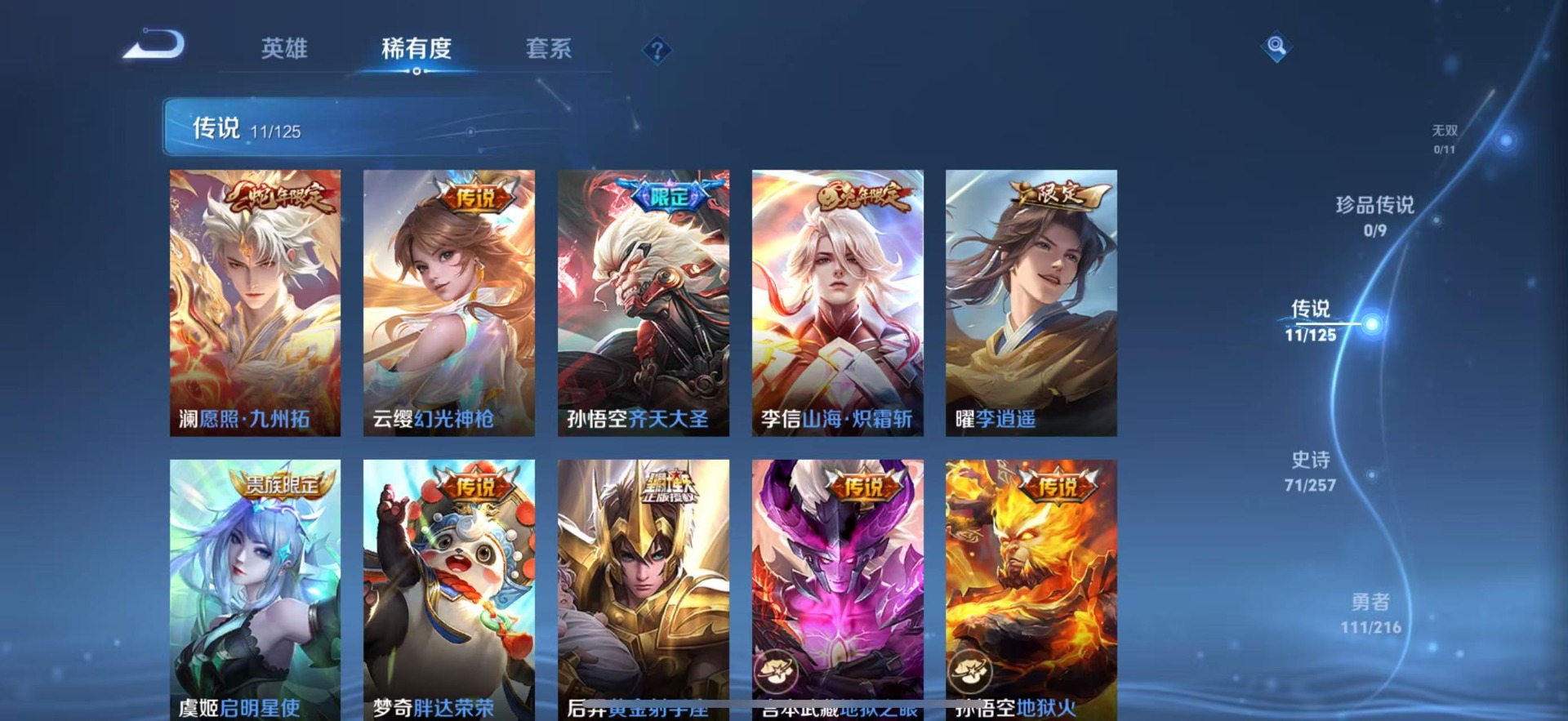 - [11884696]V7 2典藏 3珍品传说 8传说 125英雄 341皮肤 可修改实名 优质装备:鸣剑·曳影,弑枪猎影(韩信典藏),怪盗基德,一念神魔,胖达荣荣,涂山容容 珍品传说:时之奇旅-孙策,兔狲·蓬尾 传说皮:落雪白狼,死亡执政官,幻光神枪 珍宝阁皮:妄想食味,蔷薇恋人 限定皮:愿照·岁时盈(虞姬年限),逐霄战戟,鸣野蒿,白鹤梁神女,遇见飞天,五谷丰年,梁祝,李小龙,永曜之星,圣诞老人,孙行者,百木心枪,玉兔公主,天降福星 史诗皮:鸭鸭历险记-刘禅,器灵·浮梦炉,化蝶舞,星界战将,谪仙醉月,龙之律动,雪豹·霜爪,石田雨龙,百相守梦-周瑜,茶境仙,破空之剑,战舞者,东方月初,蒙犽顽岩魄,琥珀纪元伽罗,蔬乡物语(鲁班七号),百相守梦-百里守约,百相守梦-黄忠,织梦人,紫霞仙子,特工魅影,江河有灵,雪夜绮愿(周瑜),魅语,百解令(蒙犽),高渐离燃音魔法,蒙恬荣光圣徽,偶像歌手,白蛇,电玩·爆裂旋风,末日机甲-吕布,猫狗日记-孙策,乱世虎臣,节奏热浪,女仆咖啡,摇滚巨星,水果甜心,天才门将,星夜王子,心灵骇客,功夫厨神,德古拉伯爵,暗隐猎兽者,幽灵船长,鬼剑武藏,心灵战警,乐园奇幻夜,舞动绿茵,地狱岩魂,纤云弄巧,拒霜思,缤纷独角兽,乘风破浪,逐浪之夏,水晶猎龙者,曙光守护者,金属风暴,原初追逐者,圣诞狂欢,圣诞恋歌,鹰眼统帅,王者之锤,魅力维加斯,未来纪元-赵云