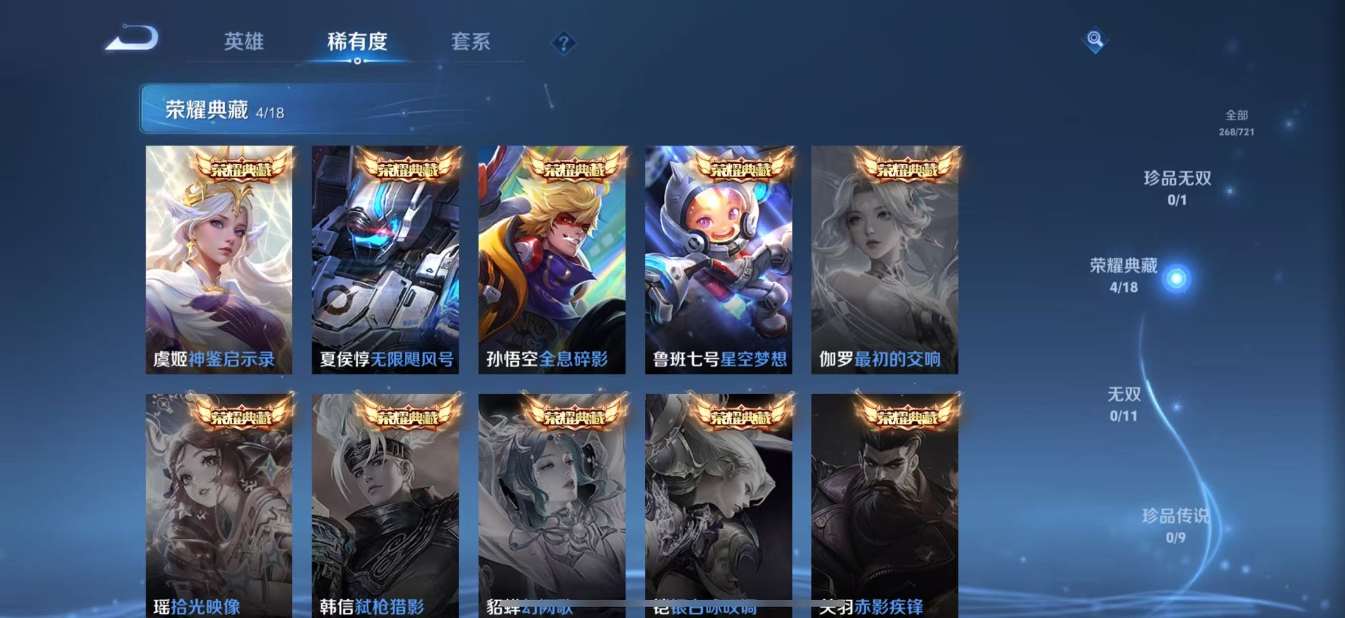 伽罗天狼溯光者,鲁班七号乒乒小将,吕布御风骁将,公孙离蜜橘之夏,裴擒虎李小龙,马可波罗逐梦之星,孙悟空孙行者,孙悟空至尊宝,孙悟空美猴王,马超神威,韩信飞衡,韩信逐梦之影,墨子降魔,澜愿照·九州拓,关羽冰锋战神