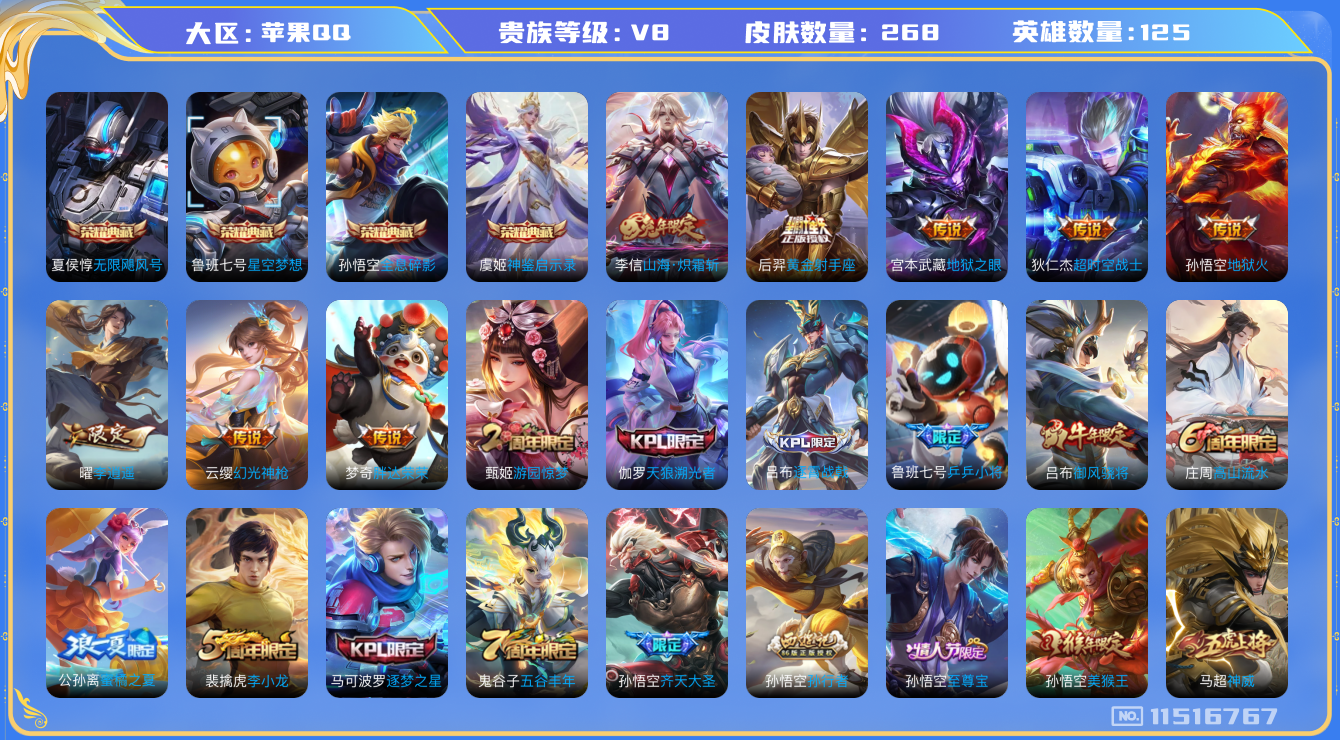 [11516767]V8 4典藏 11传说 125英雄 268皮肤 可修改实名 荣耀水晶:神鉴启示录,全息碎影(猴子典藏),无限飓风号(高达),星空梦想(太空人) 传说皮:幻光神枪,李逍遥,山海·炽霜斩(李信年限),黄金射手座,地狱火,地狱之眼,胖达荣荣,超时空战士-狄仁杰 珍宝阁皮:优雅恋人,玩趣恶龙 限定皮:愿照·九州拓(澜年限),逐霄战戟,至尊宝,神威(电光马子),飞衡(韩信年限),高山流水,齐天大圣,降魔,五谷丰年,冰锋战神,游园惊梦,御风骁将(吕布年限),逐梦之星,天狼溯光者,李小龙,逐梦之影,孙行者,乒乒小将,蜜橘之夏,美猴王 史诗皮:茶境仙,器灵·浮梦炉,龙之律动,化蝶舞,紫霞仙子,苍穹之光,电玩小子(小书包),白龙吟,特工魅影,千年之狐,冰冠公主,偶像歌手,晚萤,魅语,暗夜猫娘,龙骑士(小龙虾),时之恋人-孙尚香,乱世虎臣,节奏热浪,修罗,女仆咖啡,水果甜心,天才门将,心灵骇客,功夫厨神,暗隐猎兽者,幽灵船长,鬼剑武藏,暗渊魔法,心灵战警,地狱岩魂,诗语江南,拒霜思,缤纷独角兽,乘风破浪,逐浪之夏,曙光守护者,热力回旋,箭羽风息,唤灵魅影,金属风暴,圣诞狂欢,圣诞恋歌,鹰眼统帅,暗夜贵公子,魅力维加斯,未来纪元-赵云