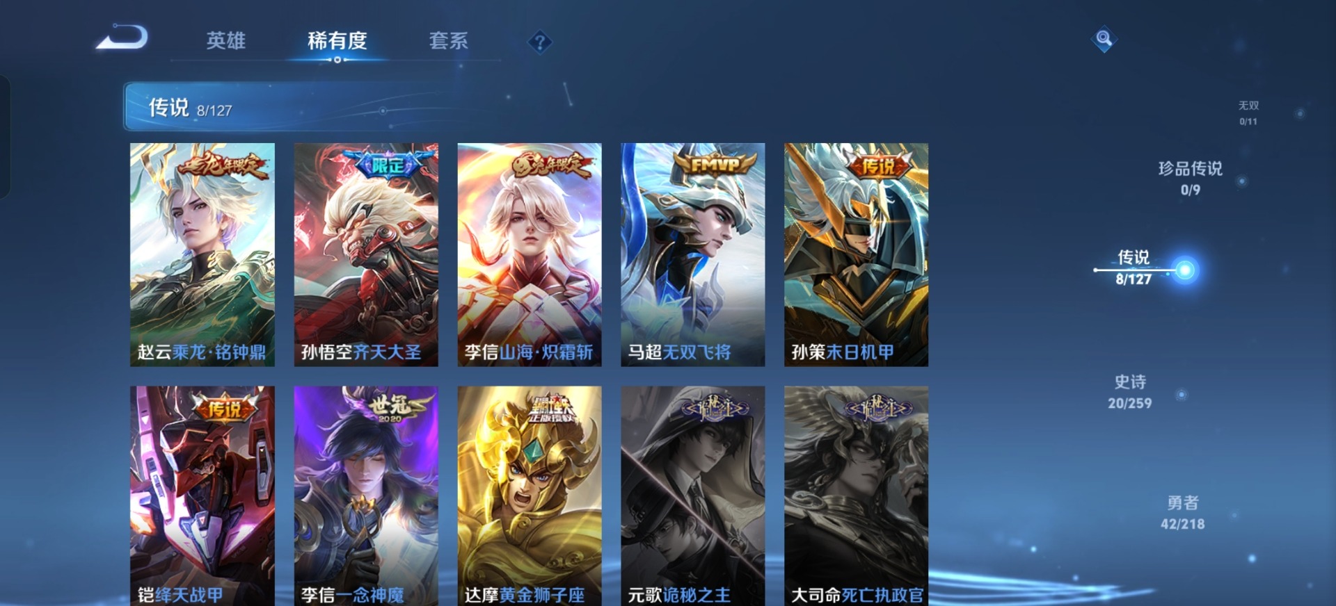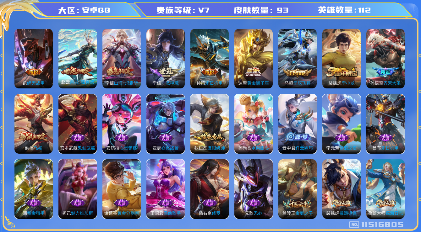 - [11272908]V7 1典藏 7传说 113英雄 149皮肤 可修改实名 优质装备:天鹅之梦(小乔典藏),久胜战神,仲夏夜之梦(大飞蛾),碎云 传说皮:幻光神枪 珍宝阁皮:优雅恋人 限定皮:愿照·九州拓(澜年限),愿照·千秋盛(女娲年限),太华(伽罗年限),遇见飞天,梁祝,李小龙,真爱至上,云端筑梦师,寅虎·心曲(虎婆),山海·玄木吟(马可年限) 史诗皮:鸭鸭历险记-刘禅,化蝶舞,茶境仙,遇见神鹿,紫霞仙子,千年之狐,永昼,偶像歌手,魅语,无限星赏官,晚萤,猫狗日记-孙策,猫狗日记-大乔,节奏热浪,修罗,女仆咖啡,水果甜心,天才门将,心灵骇客,德古拉伯爵,心灵战警,天秀·启明,地狱岩魂,纤云弄巧,繁星吟游(呼啦呼啦),拒霜思,缤纷独角兽,乘风破浪,逐浪之夏,水晶猎龙者,曙光守护者,金属风暴,圣诞狂欢,圣诞恋歌,鹰眼统帅,暗夜贵公子,魅力维加斯