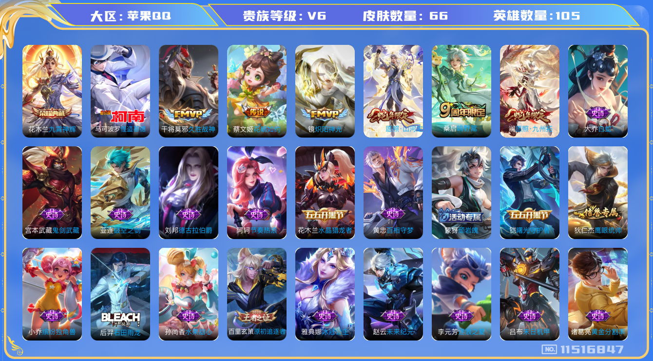 [11516847]V6 1典藏 1珍品传说 6传说 105英雄 66皮肤 可修改实名 优质装备:九霄神辉(木兰典藏),怪盗基德,久胜战神,炽阳神光,花朝如约(花篮子) 限定皮:愿照·九州拓(澜年限),愿照·山河定(司空震年限),鸣野蒿 史诗皮:石田雨龙,破空之剑,蒙犽顽岩魄,百相守梦-黄忠,黄金分割率,偶像歌手,白蛇,冰冠公主,末日机甲-吕布,节奏热浪,水果甜心,德古拉伯爵,鬼剑武藏,缤纷独角兽,逐浪之夏,水晶猎龙者,曙光守护者,原初追逐者,鹰眼统帅,未来纪元-赵云