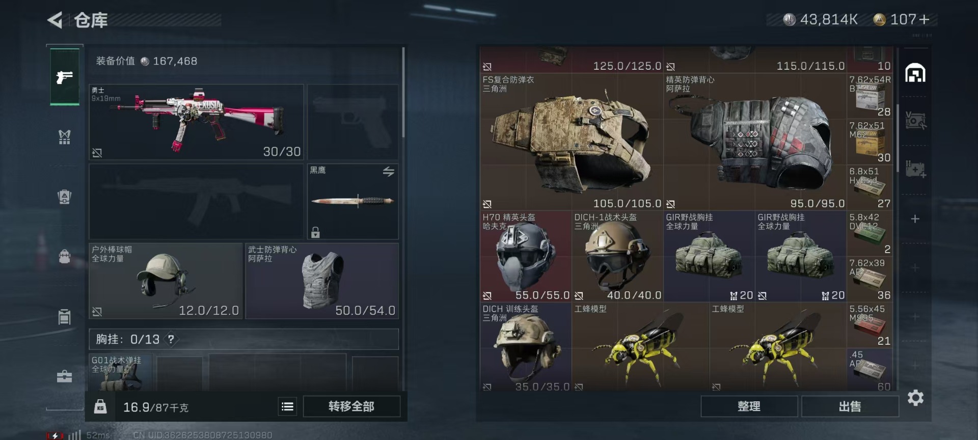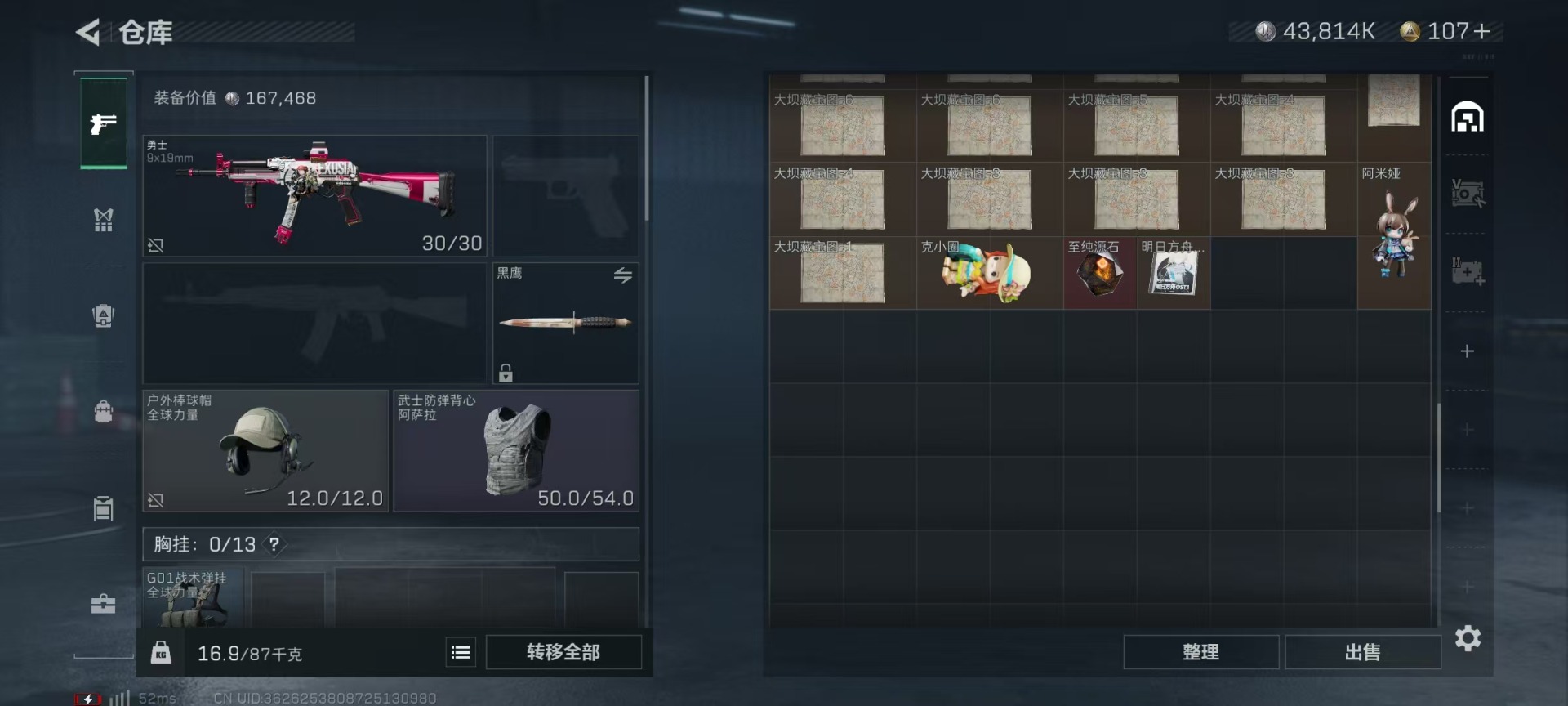 - [11468209]总资产:80.5M 3干员外观 1近战传说 20传说枪械 哈夫币:366.735K 顶级安全箱(3×3)9.15号到期 可二次 可修改实名 优质装备:近战-北极星,K416突击步枪-命运(典藏),顶级安全箱(3x3) 烽火地带段位:黑鹰 全面战场段位:无段位 传说武器皮肤:AK-12突击步枪-夜鹰,SMG45冲锋枪-骑士,93R-捞点薯条,AWM狙击步枪-捞点薯条,腾龙突击步枪-捞点薯条,AK-12突击步枪-特斯拉线圈,CAR-15突击步枪-阿米娅,SR-3M紧凑突击步枪-特斯拉线圈,UZI冲锋枪-特斯拉线圈,勇士冲锋枪-能天使-午夜邮差,Vector冲锋枪-能天使-午夜邮差,复合弓-黑-天际线,M4A1突击步枪-阿米娅,M14射手步枪-工业审判,725双管霰弹枪-送葬人-无题密令,K437突击步枪-北极星,QCQ171冲锋枪-北极星,M4A1突击步枪-蚀金玫瑰 史诗武器皮肤:AUG突击步枪-蝮蛇,M700狙击步枪-蝮蛇,PKM通用机枪-蝮蛇,Ash-12战斗步枪-守夜人,M16A4突击步枪-竞赛选手,PKM通用机枪-守夜人,AS Val突击步枪-尖端治疗,M700狙击步枪-守夜人,SR-25射手步枪-尖端治疗,PKM通用机枪-荒野求生,MP5冲锋枪-深海恐惧,勇士冲锋枪-深海恐惧,SG552突击步枪-深海恐惧,AKM突击步枪-林中猎手,SR-3M紧凑突击步枪-荒野求生,M1014霰弹枪-林中猎手,SV-98狙击步枪-林中猎手,PTR-32突击步枪-英雄,SVD狙击步枪-荒野求生,M250通用机枪-囚徒,SV-98狙击步枪-囚徒,SCAR-H战斗步枪-囚徒,腾龙突击步枪-无垢,MP7冲锋枪-无垢,PSG-1射手步枪-无垢,QBZ95-1突击步枪-曙光,Vector冲锋枪-阿萨拉文明,SVD狙击步枪-阿萨拉工艺,M700狙击步枪-竞技风 干员外观:红狼-蚀金玫瑰,露娜-黑·天际线,蛊-能天使·午夜邮差