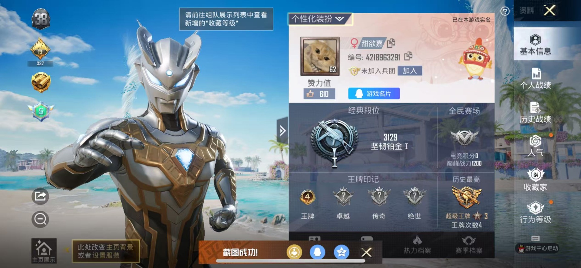 - PX_2059534-实名: 可修改 贵族等级: V10 英雄数: 123 皮肤数: 527 荣耀水晶: 天鹅之梦,鸣剑·曳影,全息碎影,银白咏叹调,弑枪猎影,拾光映像 无双皮: 青丘·九尾,器灵·螭龙剑 珍品传说: 器灵·落星盏,大耳狗之梦 星传说: 未来机甲,幽冥火,金色仲夏夜,无限倾慕,玉鸾吟,苍灵仙君,幻舞叠翠 传说皮: 黄金狮子座,冠军飞将,云鹰飞将,黄金白羊座,猫影幻舞,久胜战神,炽阳