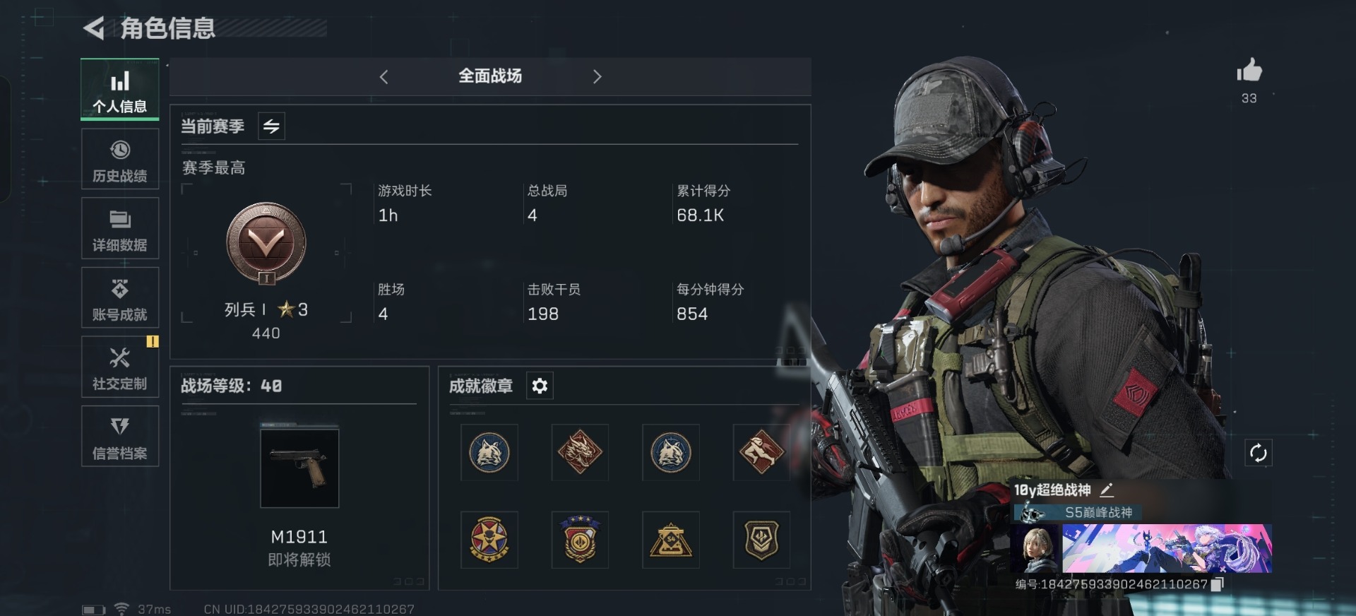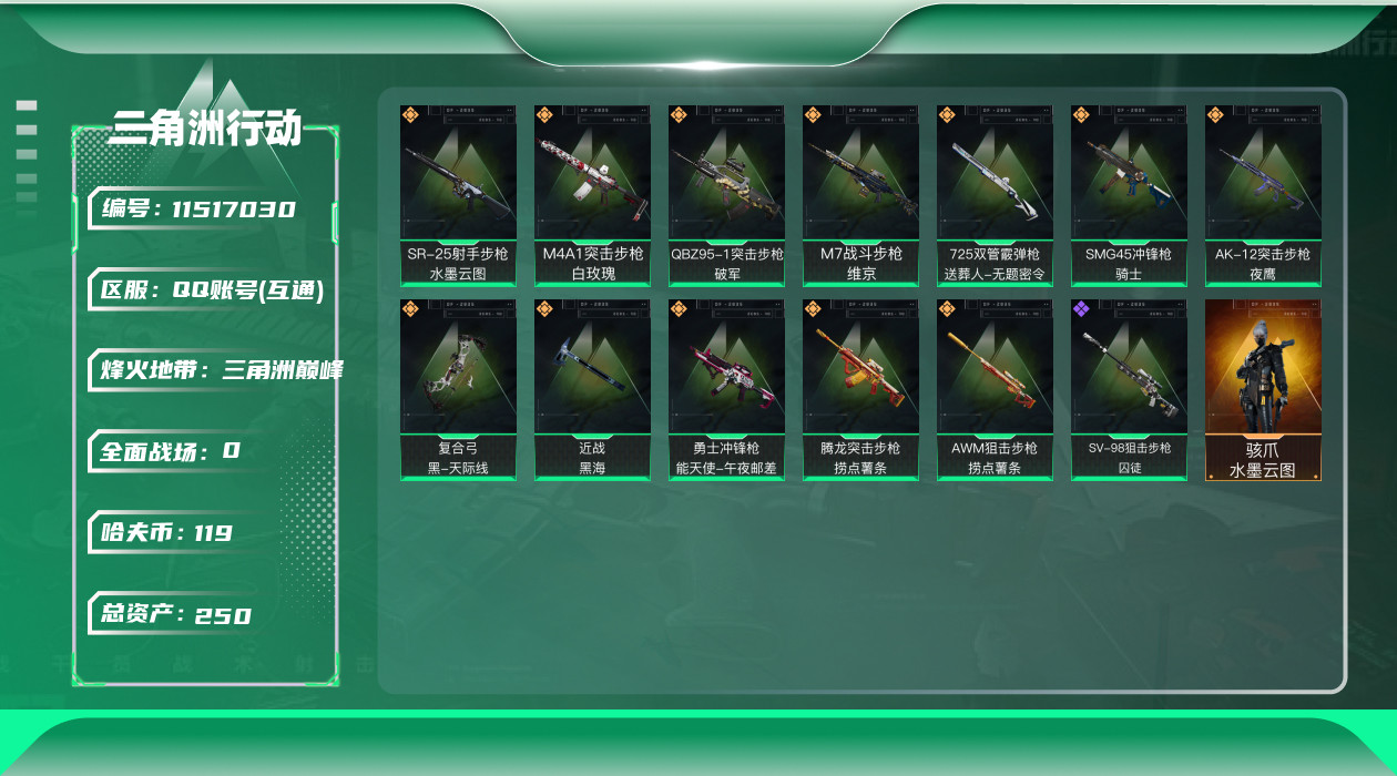 [11517030]总资产:250.7 1干员外观 1近战传说 12传说枪械 顶级安全箱(9.17到期) 可二次 可修改实名 优质装备:近战-黑海,顶级安全箱(3x3) 烽火地带段位:三角洲巅峰 全面战场段位:列兵 哈夫币:119 传说武器皮肤:SR-25射手步枪-水墨云图,AK-12突击步枪-夜鹰,SMG45冲锋枪-骑士,复合弓-黑-天际线,AWM狙击步枪-捞点薯条,腾龙突击步枪-捞点薯条,勇士冲锋枪-能天使-午夜邮差,725双管霰弹枪-送葬人-无题密令,M7战斗步枪-维京,M4A1突击步枪-白玫瑰,QBZ95-1突击步枪-破军 史诗武器皮肤:SV-98狙击步枪-囚徒 干员外观:骇爪-水墨云图