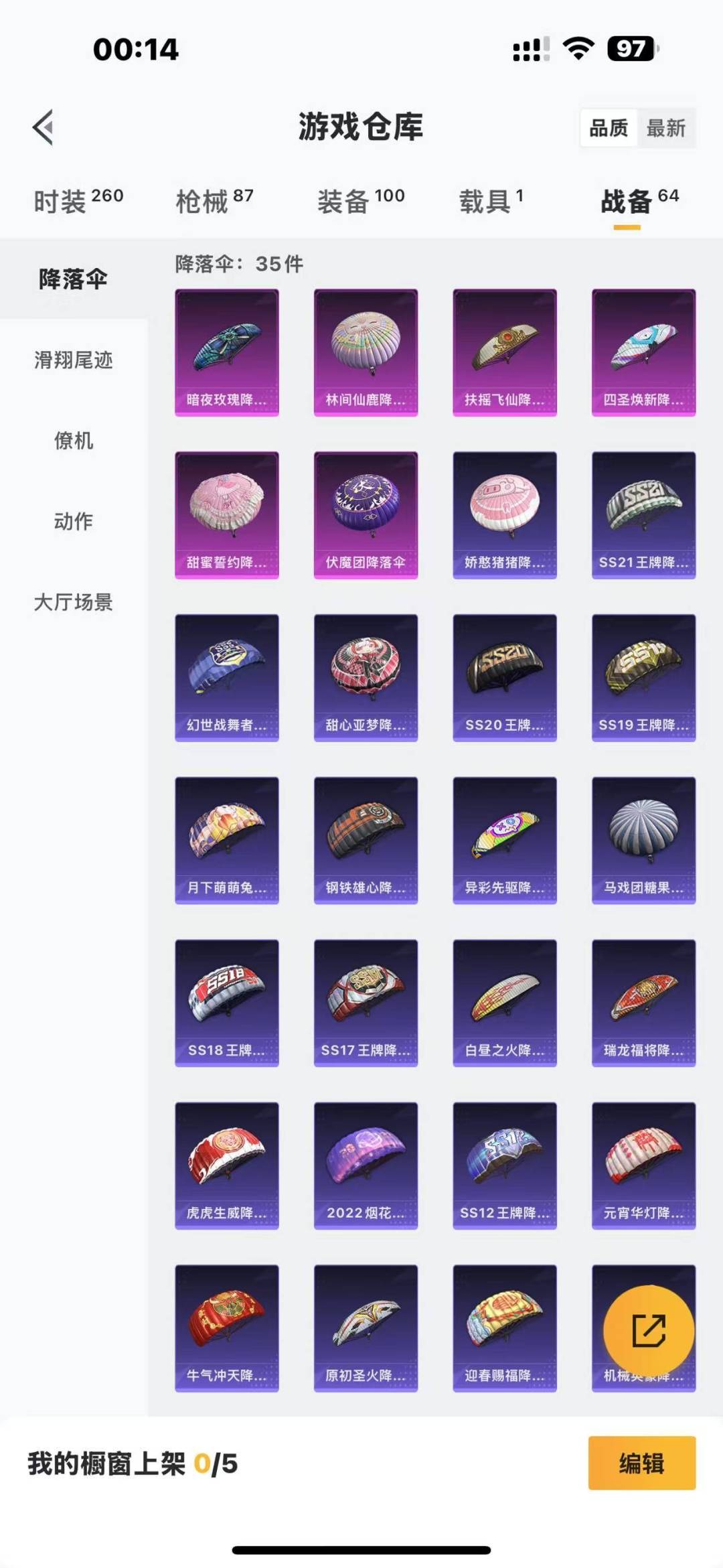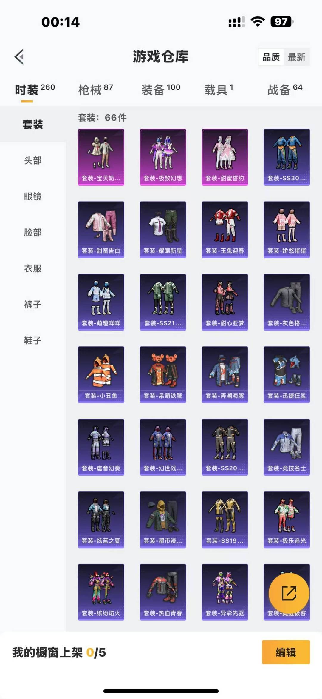 [11517122]3粉装 3特效枪 1载具 7印记 可二次 安全保护中 热门装扮:宝贝奶油派,甜蜜誓约,极致幻想,罗小黑,迅捷狂鲨,呆萌铁蟹,浪漫波比 载具:阿斯顿·马丁DBS(绿) 稀有枪皮:M416心之恋语,M762甜蜜誓约,Kar98K伏魔团 七级特效枪:七级M762-甜蜜誓约 六级特效枪:六级M416-心之恋语 二级特效枪:二级Kar98K-伏魔团 紫色装扮:萌趣咩咩,甜心亚梦,虚音幻奏,SS20特训,SS21特训,娇憨猪猪,SS30特训套装,SS13特训,SS14特训,骁骑迪迦,缤纷焰火,SS18特训,SS19特训,异彩先驱,SS16特训,瑞龙福将,团圆交子,SS17特训,极乐追光,虎虎生威吉莉,都市漫游者,都市魅力,蓝色守护者,空投萌叽,红色运动,绮丽涂鸦,耀眼新星,长空猛禽,霓虹极客,骑行爱好者,福星高照,战地菁英,幻世战舞者,甜蜜告白,特殊使命,特训学院,甜蜜熊情侣,牛气满满,灰色格斗者,炫蓝之夏,热血青春,牛气冲天,玉兔迎春,竞技名士,小丑鱼,逆风勇士,SS11特训,丝绸行者,神秘舞者,青龙圣者,原初圣火,机械征服者,机械英豪,SS10特训,纯白誓言,暗夜契约,萌黄之夏,童话森林,弄潮海豚,SS12特训 优质战备:伏魔团降落伞,繁花小夜曲飞行翼,甜蜜誓约降落伞,扶摇飞仙降落伞,飞行器-扶摇飞仙,四圣焕新降落伞,暗夜玫瑰降落伞,林间仙鹿降落伞