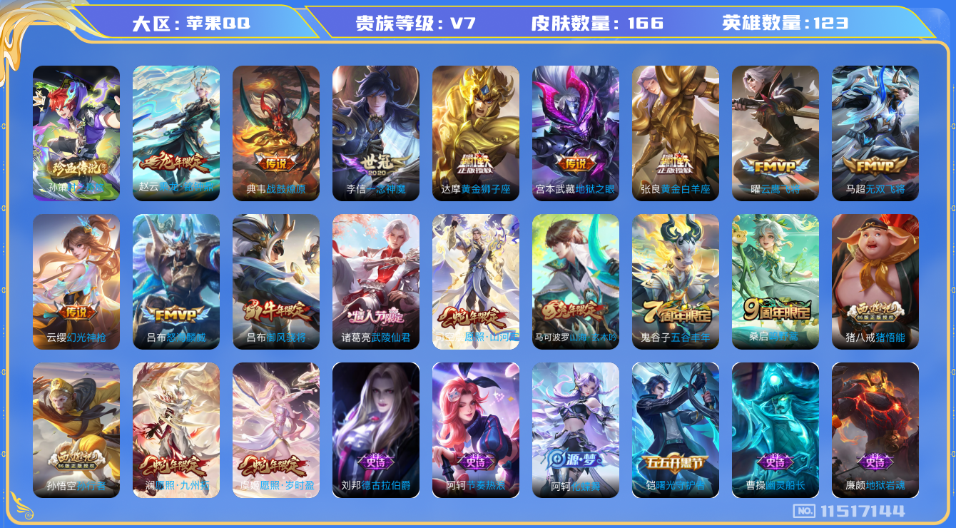 [11517144]V7 1珍品传说 15传说 123英雄 166皮肤 可修改实名 优质装备:黄金狮子座,云鹰飞将(小将军),黄金白羊座,一念神魔,地狱之眼,无双飞将 珍品传说:时之奇旅-孙策 传说皮:乘龙·铭钟鼎(赵云年限),典韦战鼓燎原,幻光神枪 珍宝阁皮:万物之道,女武神 限定皮:愿照·九州拓(澜年限),愿照·岁时盈(虞姬年限),愿照·山河定(司空震年限),鸣野蒿,武陵仙君(小桃花),怒海麟威,五谷丰年,御风骁将(吕布年限),孙行者,猪悟能,山海·玄木吟(马可年限) 史诗皮:器灵·浮梦炉,化蝶舞,龙之律动,百相守梦-百里守约,紫霞仙子,苍穹之光,千年之狐,江河有灵,百解令(蒙犽),蒙恬荣光圣徽,末日机甲-吕布,猫狗日记-孙策,时之恋人-孙尚香,乱世虎臣,节奏热浪,修罗,摇滚巨星,水果甜心,绅士熊喵,功夫厨神,德古拉伯爵,暗隐猎兽者,幽灵船长,鬼剑武藏,暗渊魔法,心灵战警,地狱岩魂,纤云弄巧,逐浪之夏,水晶猎龙者,曙光守护者,圣诞狂欢,鹰眼统帅,暗夜贵公子,魅力维加斯,黎明之约,赏金猎手,未来纪元-赵云