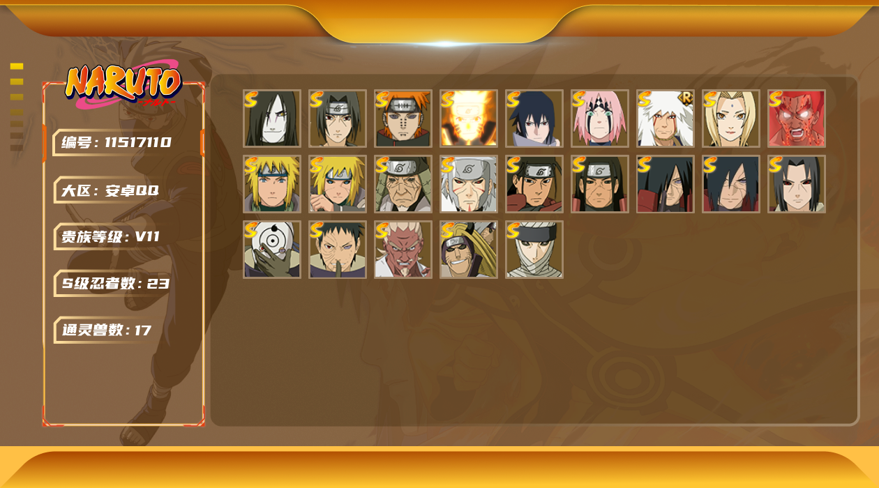 [11517110]V11 23S忍 39A忍 17通灵 1121.8W战力 可二次 可修改实名 优质装备:千手柱间「秽土转生」,宇智波鼬「秽土转生」,宇智波斑「秽土转生」,千手扉间「秽土转生」,无「二代目土影」,波风水门「秽土转生」,金角/银角「秽土转生」,猿飞日斩「秽土转生」,千手柱间,迈特凯「死门」,宇智波带土 「忍界大战」,“宇智波斑” 「白面具」,漩涡鸣人 「九喇嘛连结」,春野樱 「忍界大战」,宇智波佐助「永恒万花筒」,宇智波斑「秽土转生·解」,艾「忍界大战」 S级忍者:自来也 「舞之豪杰」,宇智波鼬 「须佐能乎」,佩恩「天道」,波风水门,大蛇丸,纲手