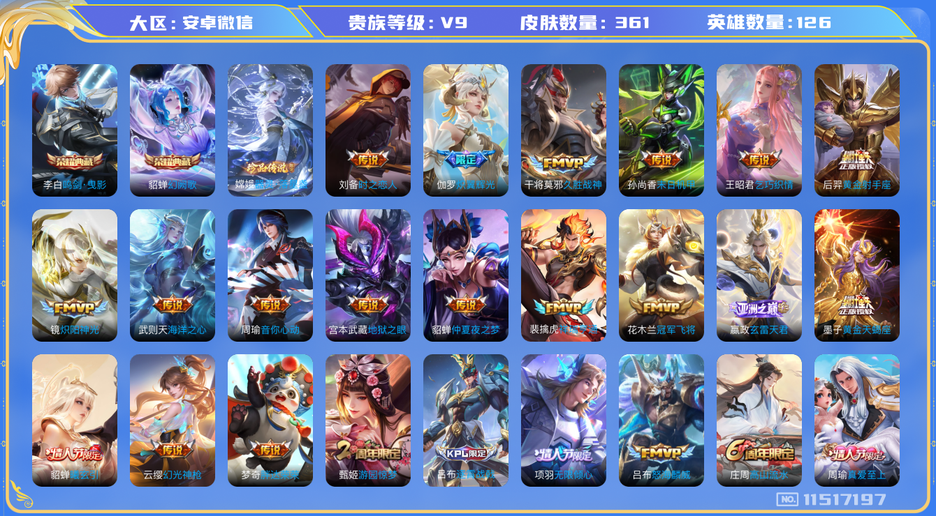 [11517197]V9 2典藏 1珍品传说 25传说 126英雄 361皮肤 典藏英雄武则天 可修改实名 安全保护中 荣耀水晶:鸣剑·曳影,幻阙歌(貂蝉典藏) 珍品传说:器灵·落星盏 传说皮:貂蝉曦玄引,黄金天蝎座,祥瑞亨通,幻光神枪,玄雷天君,黄金射手座,仲夏夜之梦(大飞蛾),海洋之心,地狱之眼,末日机甲-孙尚香(绿蚂蚱),冠军飞将,久胜战神,炽阳神光,音你心动-周瑜,胖达荣荣,乞巧织情,时之恋人-刘备(电焊工),炽翼辉光(娃娃菜牛角包) 珍宝阁皮:蔷薇恋人,玩趣恶龙 限定皮:愿照·九州拓(澜年限),逐霄战戟,鸣野蒿,傲雪梅枪,神威(电光马子),无限倾心-项羽,高山流水,诗剑行,无限倾心-虞姬,怒海麟威,降魔,五谷丰年,冰锋战神,游园惊梦,梁祝,逐梦之音,李小龙,朱雀志(守约年限),真爱至上,孙行者,山海·玄木吟(马可年限) 史诗皮:谪仙醉月,茶境仙,器灵·浮梦炉,芈月浮光幕影,怒海争锋,蔬乡物语(鲁班七号),破空之剑,琥珀纪元伽罗,紫霞仙子,苍穹之光,电玩小子(小书包),白龙吟,黄金分割率,特工魅影,千年之狐,永昼,电玩·爆裂旋风,冰冠公主,江河有灵,百解令(蒙犽),高渐离燃音魔法,蒙恬荣光圣徽,青蛇,偶像歌手,晚萤,无限星赏官,魅语,末日机甲-吕布,猫狗日记-孙策,猫狗日记-大乔,乱世虎臣,节奏热浪,修罗,女仆咖啡,摇滚巨星,水果甜心,绅士熊喵,天才门将,星夜王子,心灵骇客,功夫厨神,德古拉伯爵,暗隐猎兽者,幽灵船长,鬼剑武藏,暗渊魔法,心灵战警,舞动绿茵,地狱岩魂,诗语江南,纤云弄巧,繁星吟游(呼啦呼啦),拒霜思,缤纷独角兽,乘风破浪,逐浪之夏,水晶猎龙者,曙光守护者,唤灵魅影,箭羽风息,金属风暴,圣诞狂欢,圣诞恋歌,鹰眼统帅,暗夜贵公子,魅力维加斯,黎明之约,赏金猎手,无心,未来纪元-赵云
