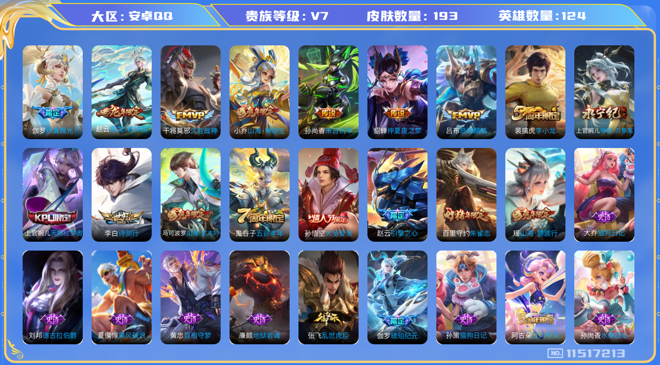 [11517213]V7 8传说 124英雄 193皮肤 可修改实名 优质装备:久胜战神,末日机甲-孙尚香(绿蚂蚱),仲夏夜之梦(大飞蛾),山海·琳琅生(小乔年限),炽翼辉光(娃娃菜牛角包) 传说皮:乘龙·铭钟鼎(赵云年限) 珍宝阁皮:妄想食味,蔷薇恋人 限定皮:山海·碧波行(瑶年限),诗剑行,怒海麟威,五谷丰年,天狼绘梦者,李小龙,朱雀志(守约年限),大圣娶亲,引擎之心,神器·万象笔,山海·玄木吟(马可年限) 史诗皮:星界战将,龙之律动,百相守梦-黄忠,琥珀纪元伽罗,苍穹之光,电玩小子(小书包),白龙吟,永昼,浮梦罗烟,江河有灵,蒙恬荣光圣徽,魅语,电玩·爆裂旋风,末日机甲-吕布,猫狗日记-孙策,猫狗日记-大乔,乱世虎臣,摇滚巨星,水果甜心,天才门将,心灵骇客,功夫厨神,德古拉伯爵,暗隐猎兽者,鬼剑武藏,暗渊魔法,心灵战警,舞动绿茵,地狱岩魂,拒霜思,乘风破浪,逐浪之夏,水晶猎龙者,金属风暴,原初追逐者,圣诞狂欢,圣诞恋歌,鹰眼统帅,魅力维加斯,黎明之约,无心