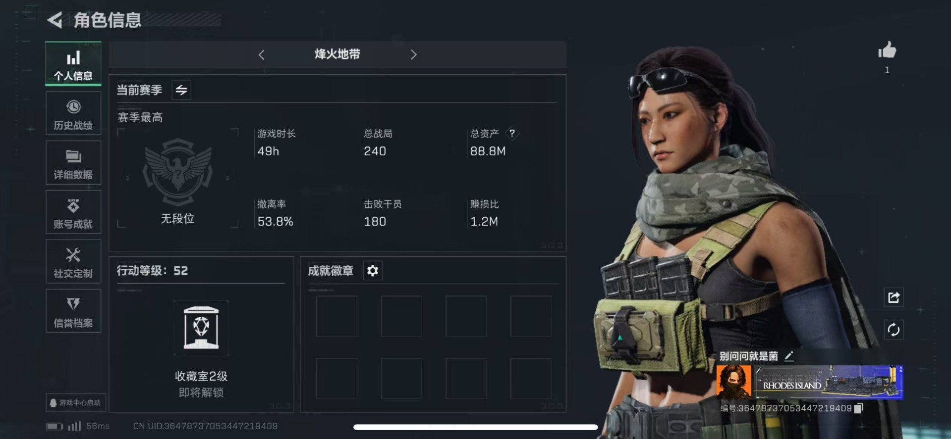 [11517240]总资产:88.8M 7传说枪械 哈夫币:70.463K 进阶安全箱(9.17到期) 可二次 可修改实名 烽火地带段位:无段位 全面战场段位:无段位 传说武器皮肤:M4A1突击步枪-阿米娅,CAR-15突击步枪-阿米娅,复合弓-黑-天际线,AK-12突击步枪-特斯拉线圈,SR-3M紧凑突击步枪-特斯拉线圈,UZI冲锋枪-特斯拉线圈,勇士冲锋枪-能天使-午夜邮差