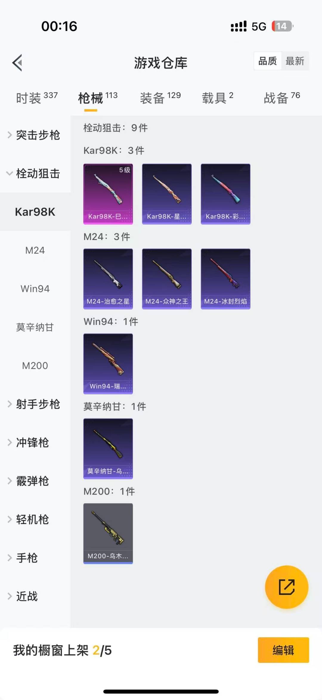 - [12167983]总资产:34.1M 4干员外观 2近战传说 19传说枪械 哈夫币:1.263K 可二次 可修改实名 优质装备:近战-影锋,近战-北极星,顶级安全箱(3x3) 烽火地带段位:钻石 全面战场段位:列兵 传说武器皮肤:SR-25射手步枪-水墨云图,SCAR-H战斗步枪-铁艺苍穹,SMG45冲锋枪-骑士,UZI冲锋枪-特斯拉线圈,AWM狙击步枪-捞点薯条,腾龙突击步枪-捞点薯条,93R-捞点薯条,AK-12突击步枪-特斯拉线圈,SR-3M紧凑突击步枪-特斯拉线圈,勇士冲锋枪-能天使-午夜邮差,复合弓-黑-天际线,K437突击步枪-北极星,QCQ171冲锋枪-北极星,725双管霰弹枪-送葬人-无题密令,M4A1突击步枪-阿米娅,AK-12突击步枪-夜鹰,M4A1突击步枪-蚀金玫瑰 史诗武器皮肤:PSG-1射手步枪-原型机(典藏),SR-3M紧凑突击步枪-英雄,PTR-32战斗步枪-ACE,QBZ95-1突击步枪-ACE,M4A1突击步枪-特勤执行,Vector冲锋枪-红色彗星,AUG突击步枪-特勤执行,SKS射手步枪-ACE,PKM通用机枪-蝮蛇,AUG突击步枪-蝮蛇,M700狙击步枪-蝮蛇,G3战斗步枪-战场英杰,SG552突击步枪-尖端治疗,QJB201轻机枪-Old Habits,M1014霰弹枪-林中猎手,PKM通用机枪-守夜人,AS Val突击步枪-尖端治疗,M700狙击步枪-守夜人,Ash-12战斗步枪-守夜人,SR-25射手步枪-尖端治疗,MP5冲锋枪-深海恐惧,勇士冲锋枪-深海恐惧,SG552突击步枪-深海恐惧,AKM突击步枪-林中猎手,.357左轮-幸运时刻,M16A4突击步枪-竞赛选手,SV-98狙击步枪-林中猎手,PTR-32突击步枪-英雄,AS Val突击步枪-典狱官,SV-98狙击步枪-囚徒,SCAR-H战斗步枪-囚徒,腾龙突击步枪-无垢,MP7冲锋枪-无垢,PSG-1射手步枪-无垢,SVD狙击步枪-荒野求生,SR-3M紧凑突击步枪-荒野求生,PKM通用机枪-荒野求生,QBZ95-1突击步枪-曙光,沙漠之鹰-曙光,Vector冲锋枪-阿萨拉文明,SVD狙击步枪-阿萨拉工艺,S12K霰弹枪-曙光,PKM通用机枪-英雄,M700狙击步枪-竞技风,QSZ92G-风林火山 干员外观:红狼-蚀金玫瑰,威龙-飞虎,蜂医-送葬人·无题密令(S5),露娜-黑·天际线