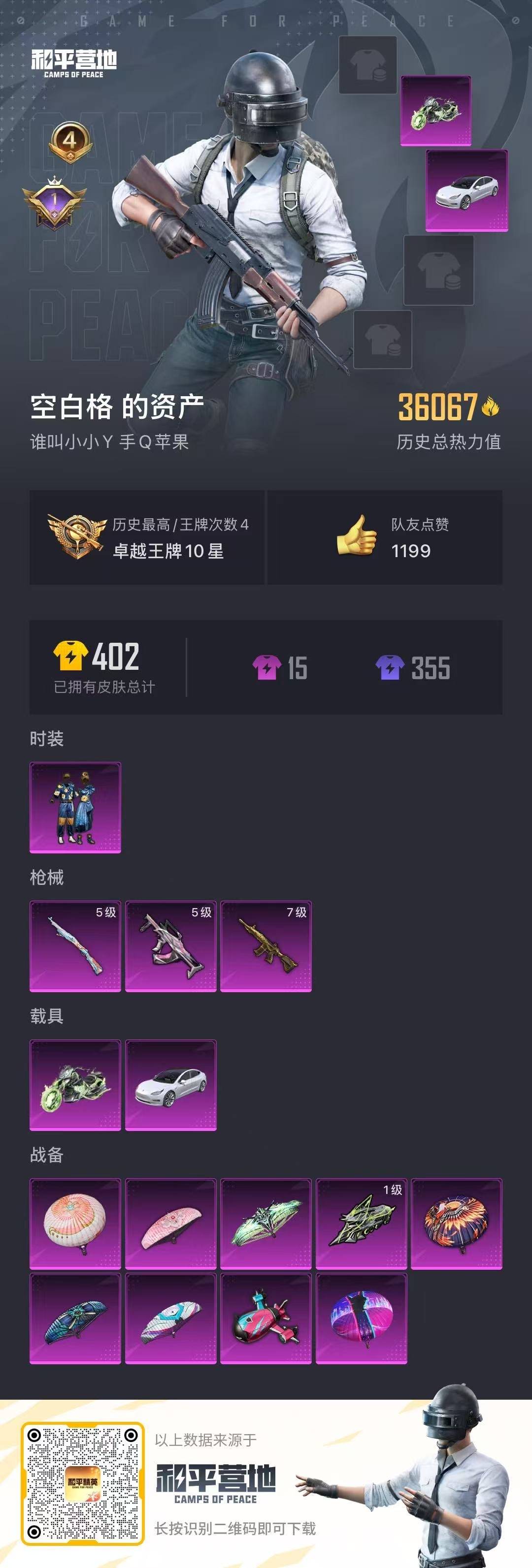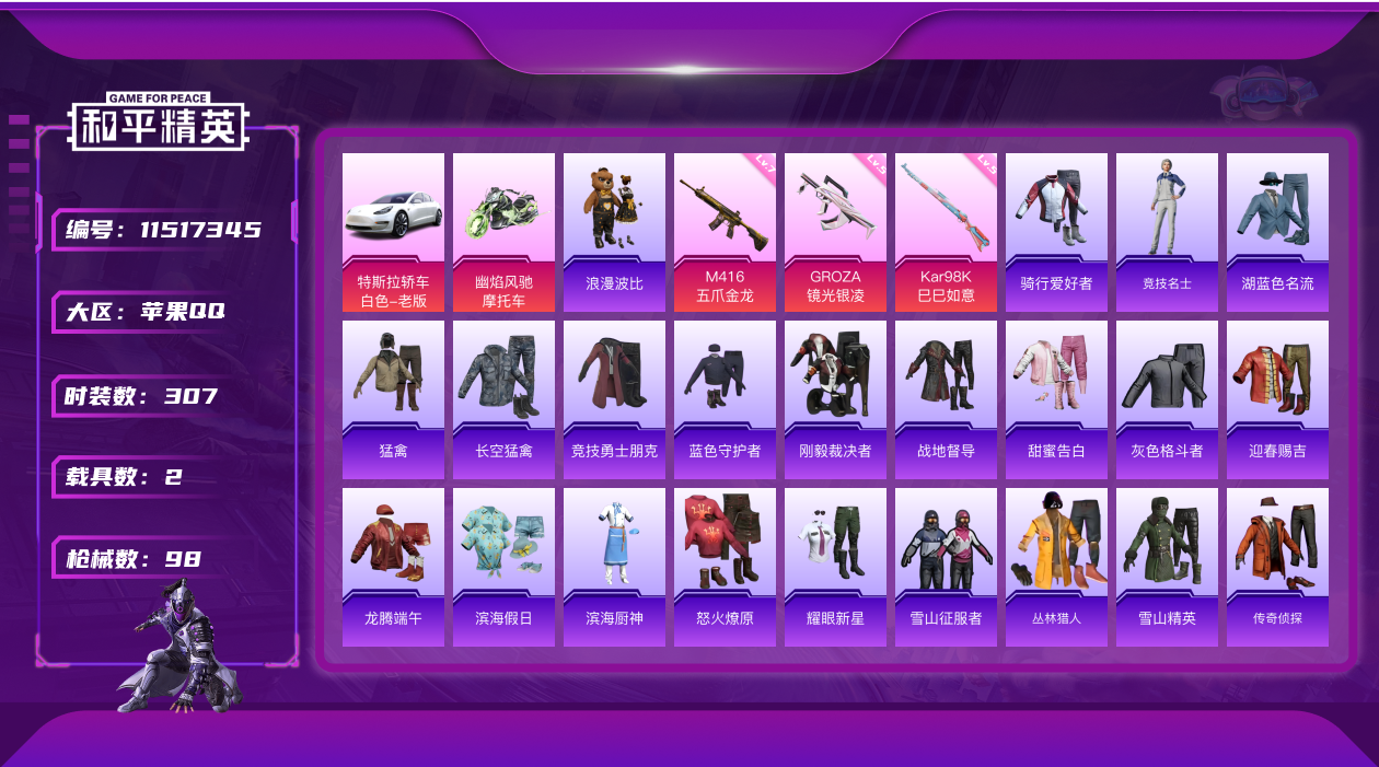 [11517345]1粉装 3特效枪 2载具 4印记 可二次 可修改实名 优质装备:幽焰风驰摩托车,特斯拉Model 3(珍珠白),M416五爪金龙,七级M416-五爪金龙,GROZA-镜光银凌,Kar98K-巳巳如意 时装数:307 枪械数:98 战备数:2 热门装扮:浪漫波比 五级特效枪:五级GROZA-镜光银凌,五级Kar98K-巳巳如意 紫色装扮:SS22特训,SS23特训,SS21特训,SS31特训套装,SS5特训,凛冬战士,刚毅裁决者,北国孤狼,SS30特训套装,SS33特训套装,SS20特训,SS13特训,诡谋托雷基亚,治愈之星,科技之星,SS14特训,瑞龙福将,团圆交子,SS17特训,长空猛禽,雪山征服者,雪山精英,霓虹街区,迎春赐吉,缤纷果语,耀眼新星,蓝色守护者,虎虎生威吉莉,跃动心情,龙腾端午,骑行爱好者,鹤鸣,格斗先锋,滨海假日,圣诞大吉,幻世战舞者,怒火燎原,战地督导,湖蓝色名流,滨海厨神,疯狂小兔子,破蛋小黄鸡,甜蜜告白,福星高照,竞技勇士朋克,灰色格斗者,熔岩使者,牛气满满,猛禽,青团波波,糖糖葫芦,竞技名士,街头风暴,精神漫游,炽焰拳师,格斗专家,SS6特训,赛博空间,核芯基因,SS7特训,摇滚狂鲨,拳皇97草薙京,玲珑飞花,SS8特训,原初圣火,逆风勇士,SS12特训,众神之王,智慧之神,SS9特训,SS10特训,SS11特训,耀粉歌者,SS32特训服(SS32特训套装),萌黄之夏,新风雅兰,恋语绒绒,丛林猎人,传奇侦探,海上生明月,爆竹金鼠 优质战备:幽焰列车飞行器,幽焰骑士降落伞,临安公主降落伞,桃粉嫣然降落伞,炫紫旋律降落伞,飞行器-神秘黑猫,四圣焕新降落伞,暗夜玫瑰降落伞,风花雪月降落伞