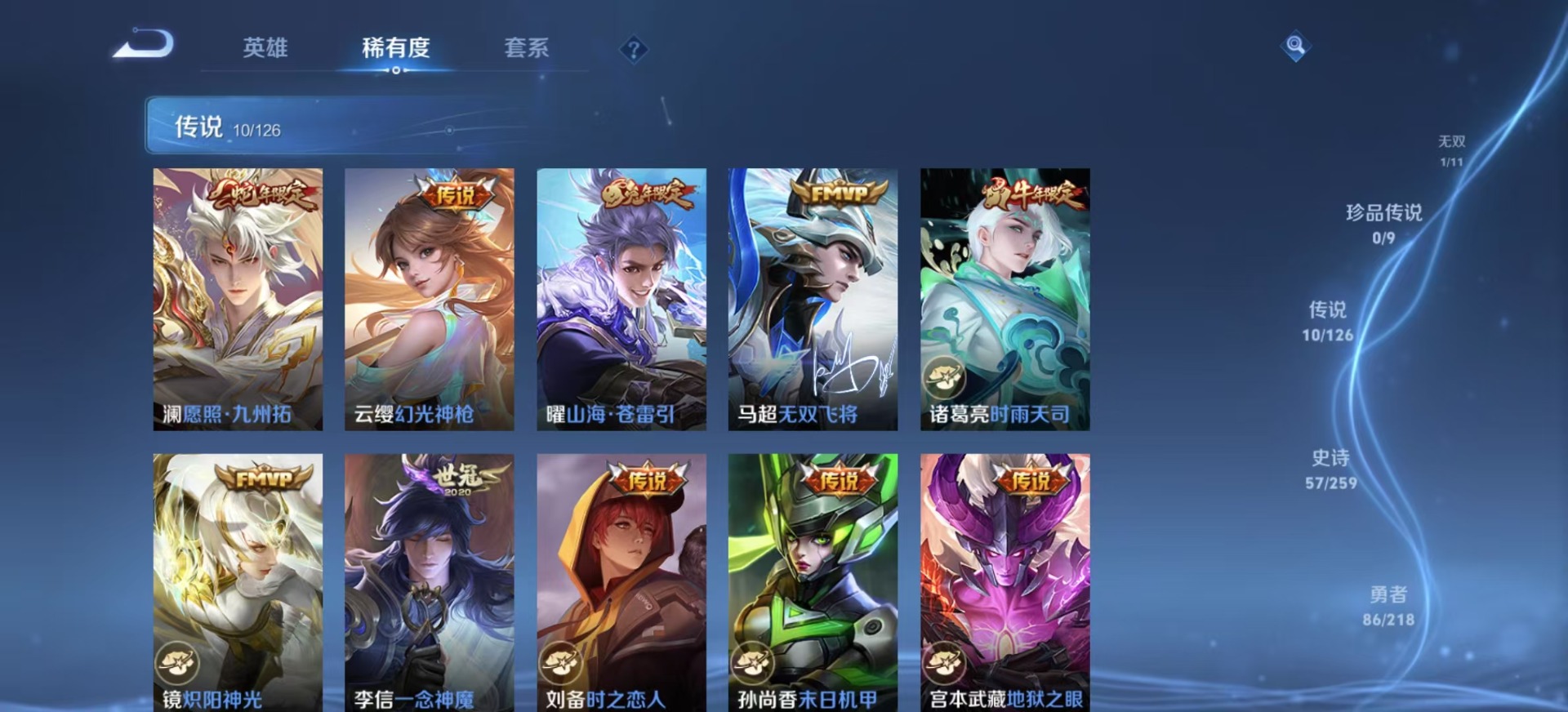 - [12061709]V8 1典藏 15传说 125英雄 306皮肤 可修改实名 刘备小国标 优质装备:鸣剑·曳影,黄金狮子座,久胜战神,末日机甲-孙尚香(绿蚂蚱),零号·赤焰,时之恋人-刘备(电焊工),超时空战士-狄仁杰,电玩·雷克斯 传说皮:祥瑞亨通,幻光神枪 珍宝阁皮:妄想食味,玩趣恶龙 限定皮:愿照·九州拓(澜年限),愿照·山河定(司空震年限),鸣野蒿,至尊宝,白虎志(电光耗子),时雨天司(水龙头),遇见飞天,高山流水,五谷丰年,梁祝,天狼狩猎者,岱宗(典韦年限),李小龙,默契交锋-花木兰,猪悟能,大圣娶亲,美猴王,时之祈愿-云中君 史诗皮:器灵·浮梦炉,化蝶舞,茶境仙,百相守梦-黄忠,紫霞仙子,苍穹之光,电玩小子(小书包),白龙吟,特工魅影,千年之狐,永昼,江河有灵,百解令(蒙犽),高渐离燃音魔法,蒙恬荣光圣徽,无限星赏官,白蛇,电玩·兔顽号,百相守梦(刘备),暗夜猫娘,龙骑士(小龙虾),末日机甲-吕布,猫狗日记-孙策,乱世虎臣,节奏热浪,摇滚巨星,水果甜心,星夜王子,功夫厨神,德古拉伯爵,暗隐猎兽者,幽灵船长,鬼剑武藏,心灵战警,乐园奇幻夜,舞动绿茵,地狱岩魂,纤云弄巧,繁星吟游(呼啦呼啦),拒霜思,缤纷独角兽,乘风破浪,逐浪之夏,月团寄思,水晶猎龙者,曙光守护者,箭羽风息,金属风暴,原初追逐者,圣诞狂欢,圣诞恋歌,鹰眼统帅,魅力维加斯,黎明之约,赏金猎手,无心,未来纪元-赵云