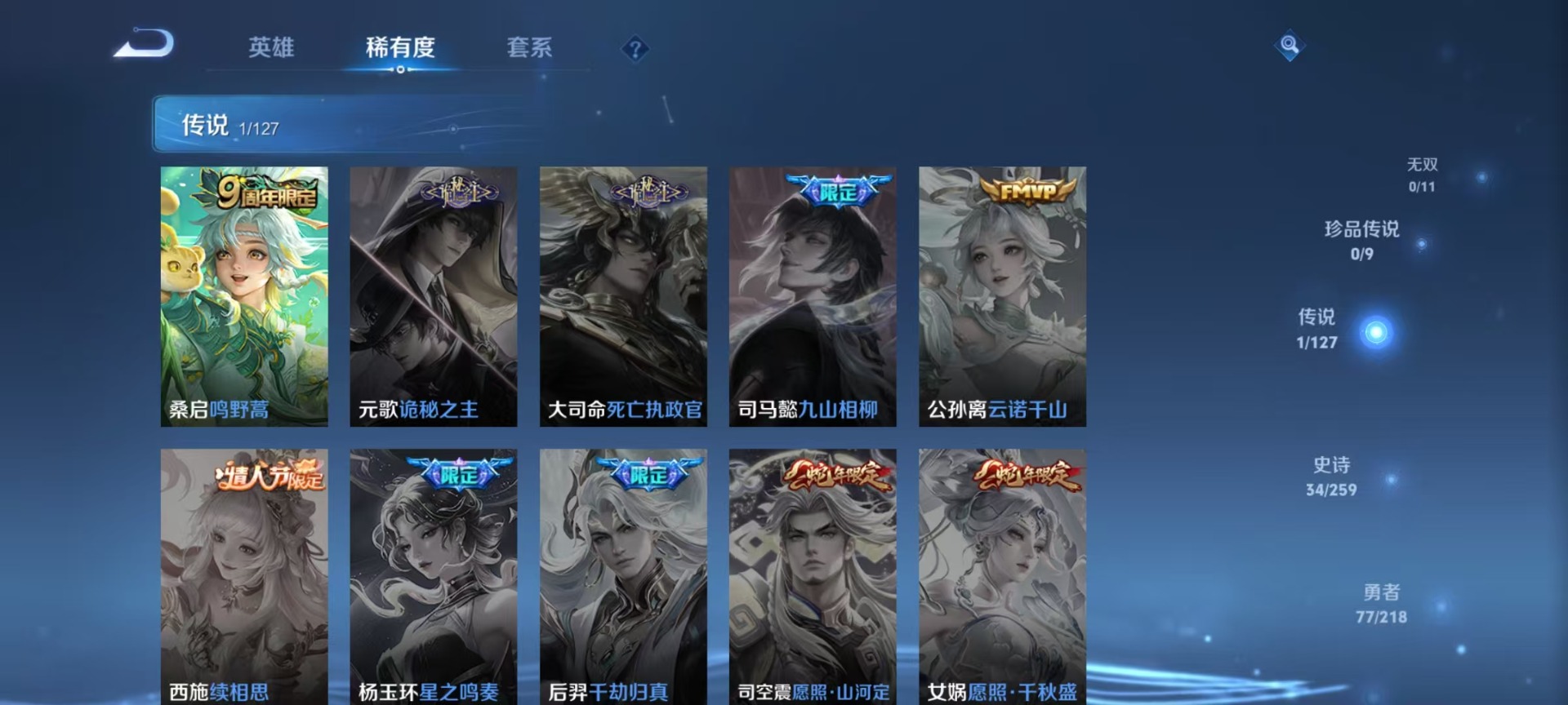 - [12091400]V9 2典藏 19传说 124英雄 275皮肤 可修改实名 优质装备:鸣剑·曳影,星域神启(倪克斯贼亮),云鹰飞将(小将军),炽阳神光,地狱火,仲夏夜之梦(大飞蛾),地狱之眼,胖达荣荣,淬星耀世,挚爱之约,挚爱花嫁,碎云,鹤羽星尊,澜逐花归海 珍宝阁皮:优雅恋人 限定皮:至尊宝,武陵仙君(小桃花),补天,时雨天司(水龙头),神威(电光马子),诗剑行,五谷丰年,青龙志(铠年限),冰锋战神,武圣,梁祝,辉光之辰,真爱至上,大圣娶亲,寅虎·心曲(虎婆),寅虎·赤拳(老虎年限) 史诗皮:星界战将,龙之律动,百相守梦-周瑜,遇见神鹿,紫霞仙子,电玩小子(小书包),白龙吟,黄金分割率,特工魅影,千年之狐,江河有灵,鹤归松栖(赵怀真),魅语,百解令(蒙犽),蒙恬荣光圣徽,无限星赏官,偶像歌手,晚萤,龙骑士(小龙虾),末日机甲-吕布,猫狗日记-孙策,时之恋人-孙尚香,乱世虎臣,节奏热浪,修罗,女仆咖啡,摇滚巨星,水果甜心,天才门将,星夜王子,功夫厨神,德古拉伯爵,暗隐猎兽者,幽灵船长,鬼剑武藏,暗渊魔法,心灵战警,舞动绿茵,地狱岩魂,拒霜思,缤纷独角兽,乘风破浪,逐浪之夏,水晶猎龙者,曙光守护者,箭羽风息,金属风暴,原初追逐者,圣诞狂欢,圣诞恋歌,鹰眼统帅,暗夜贵公子,黎明之约,赏金猎手,无心,未来纪元-赵云