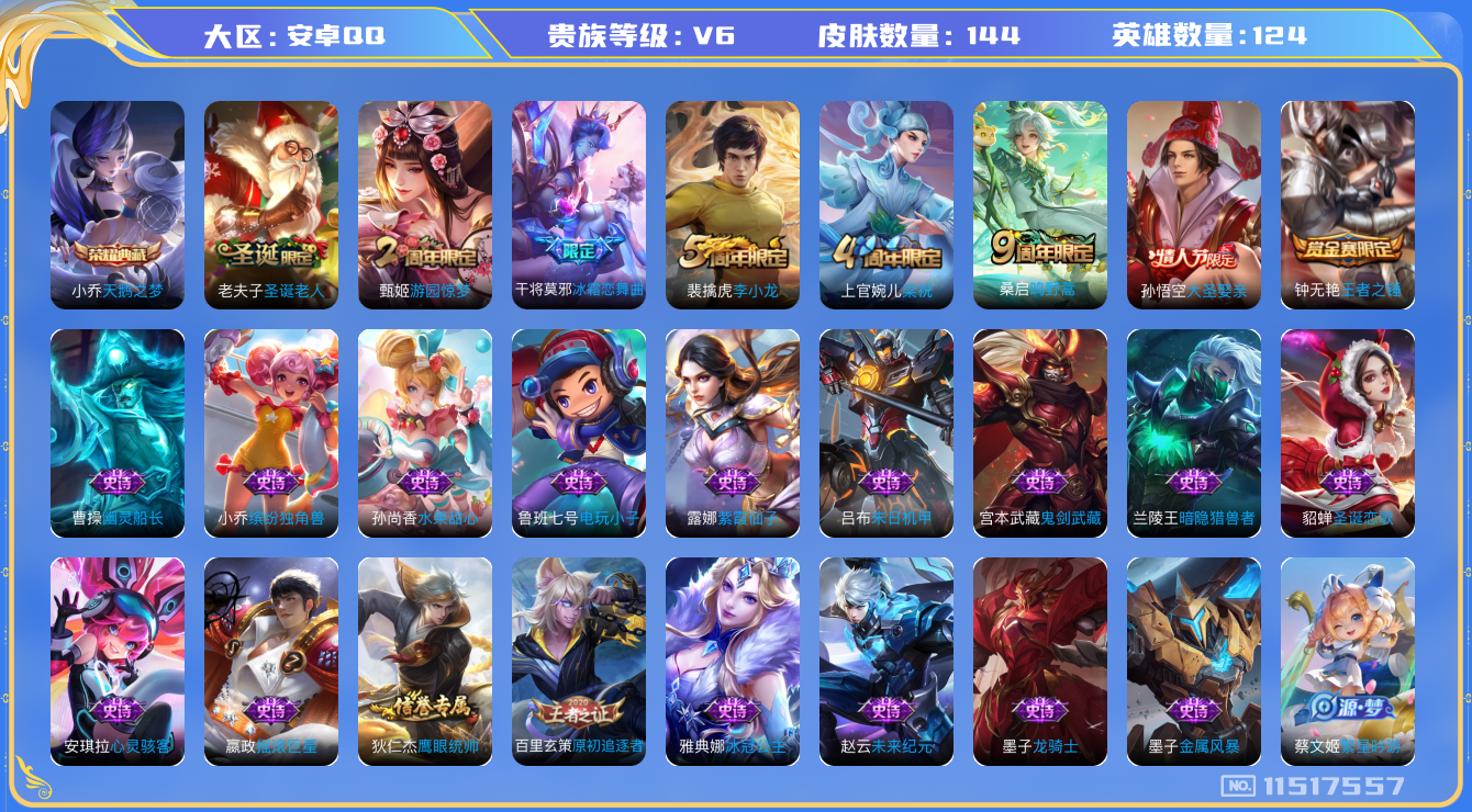 [11517557]V6 1典藏 1传说 124英雄 144皮肤 可修改实名 优质装备:天鹅之梦(小乔典藏) 珍宝阁皮:蔷薇恋人 限定皮:鸣野蒿,游园惊梦,梁祝,李小龙,圣诞老人,大圣娶亲,冰霜恋舞曲 史诗皮:紫霞仙子,电玩小子(小书包),偶像歌手,龙骑士(小龙虾),冰冠公主,末日机甲-吕布,摇滚巨星,水果甜心,心灵骇客,暗隐猎兽者,幽灵船长,鬼剑武藏,繁星吟游(呼啦呼啦),缤纷独角兽,金属风暴,原初追逐者,圣诞恋歌,鹰眼统帅,王者之锤,魅力维加斯,未来纪元-赵云