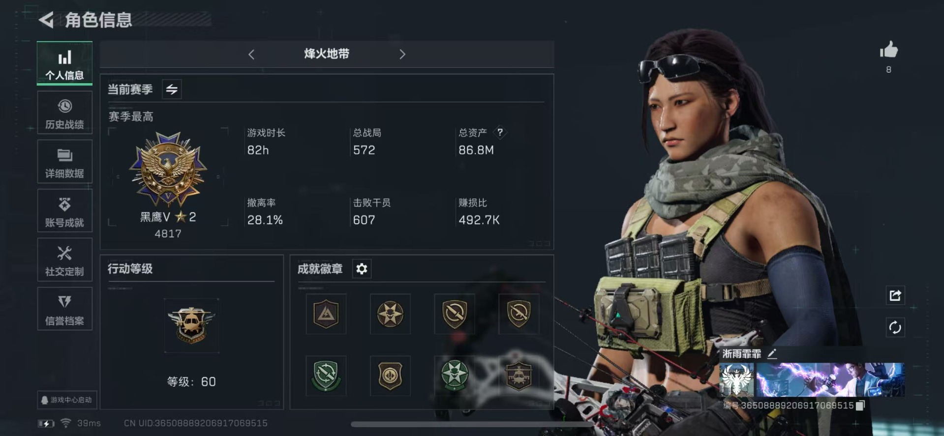 - [11911153]总资产:86.4M 10传说枪械 哈夫币:59.381K 可二次 可修改实名 烽火地带段位:钻石 全面战场段位:无段位 传说武器皮肤:AK-12突击步枪-特斯拉线圈,SR-3M紧凑突击步枪-特斯拉线圈,UZI冲锋枪-特斯拉线圈,勇士冲锋枪-能天使-午夜邮差,Vector冲锋枪-能天使-午夜邮差,M16A4突击步枪-狩猎时刻,G3战斗步枪-狩猎时刻,M4A1突击步枪-阿米娅,CAR-15突击步枪-阿米娅,Vector冲锋枪-狩猎时刻 史诗武器皮肤:PKM通用机枪-蝮蛇,SCAR-H战斗步枪-囚徒,SV-98狙击步枪-囚徒,SV-98狙击步枪-林中猎手,P90冲锋枪-紧急戒备,QJB201轻机枪-Old Habits,M16A4突击步枪-竞赛选手,勇士冲锋枪-深海恐惧